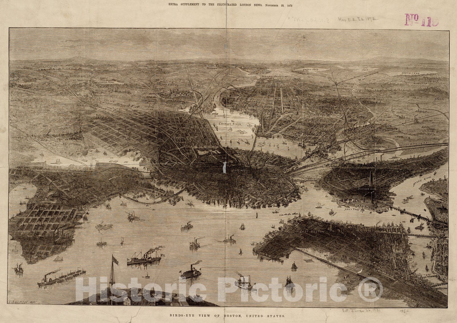 Historical Map, 1870-1879 Bird's-Eye View of Boston, United States, Vintage Wall Art
