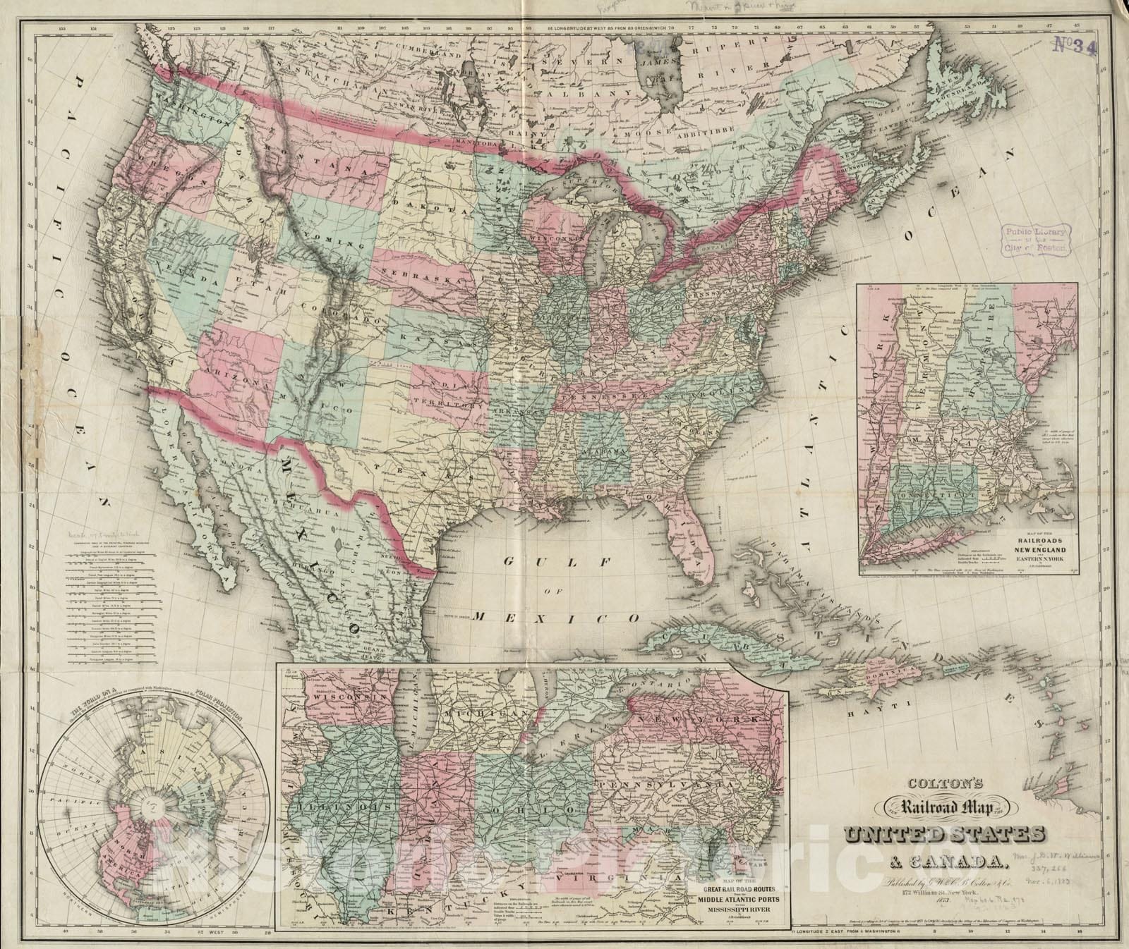 Historical Map, 1873 Colton's New Railroad map of The United States & Canada, Vintage Wall Art