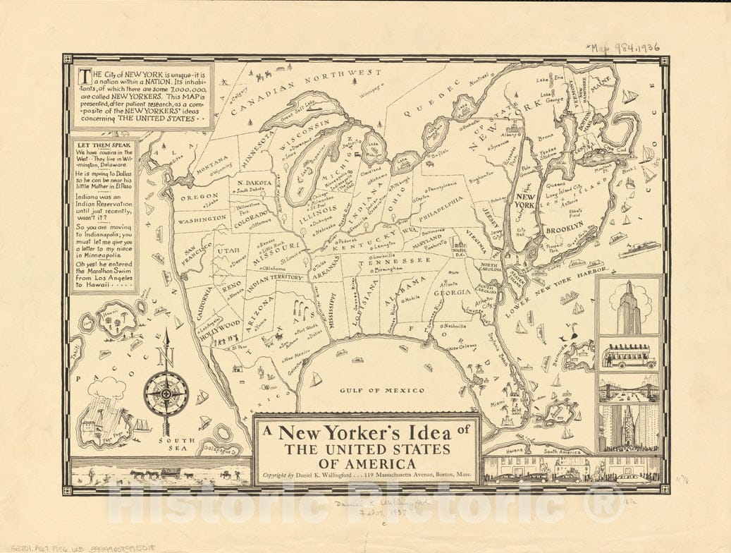 Historical Map, 1936 A New Yorker's idea of The United States of America, Vintage Wall Art