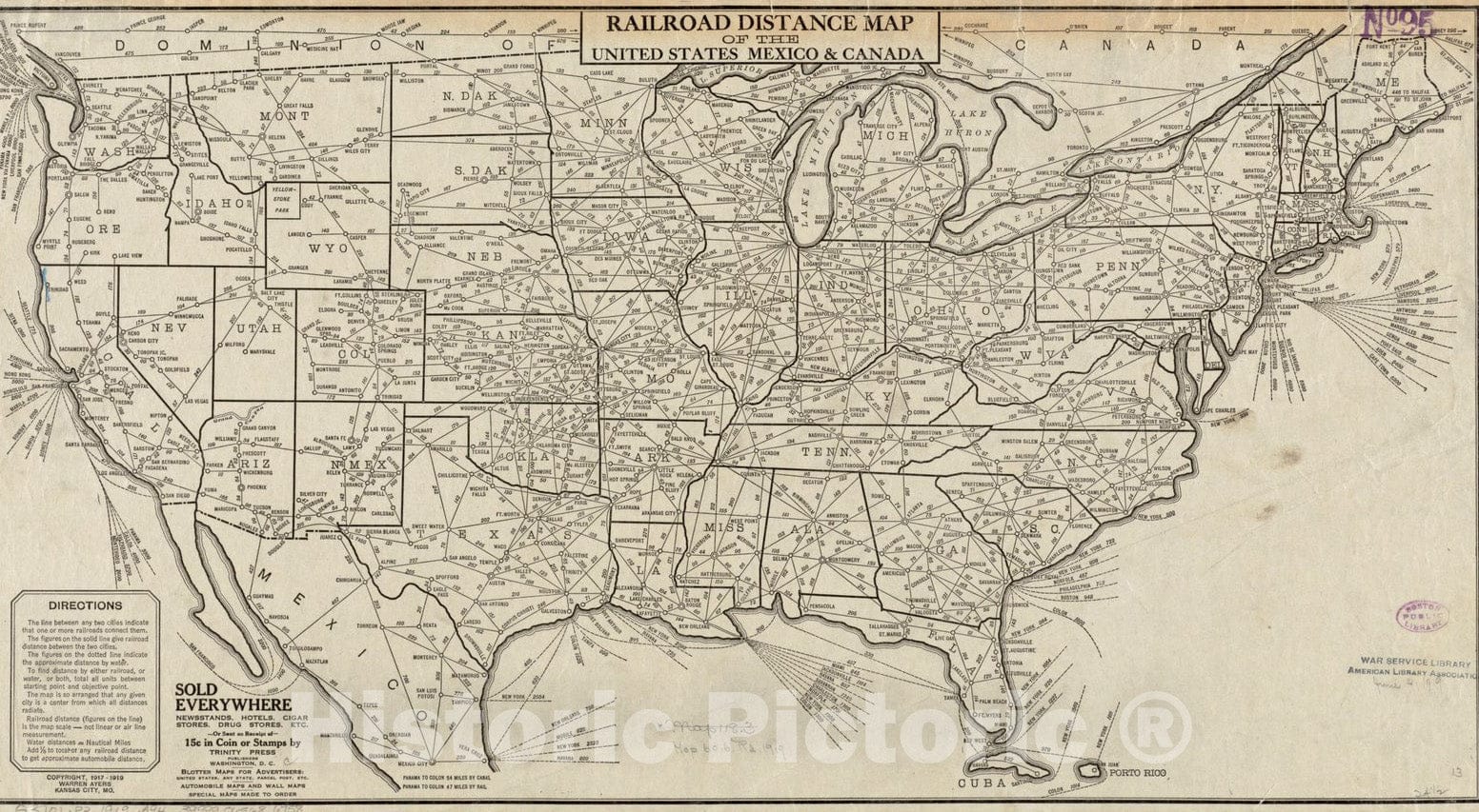 Historical Map, ca. 1917-1919 Railroad Distance map of The United States, Mexico & Canada, Vintage Wall Art