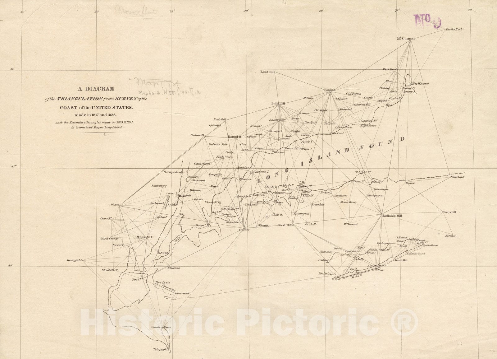 • Historical Map, A Diagram of The Triangulation for The Survey of The Coast of The United States, Made in 1817 and 1833, and The Secondary Triangles Made in 1833 & 1834, Vintage Wall Art