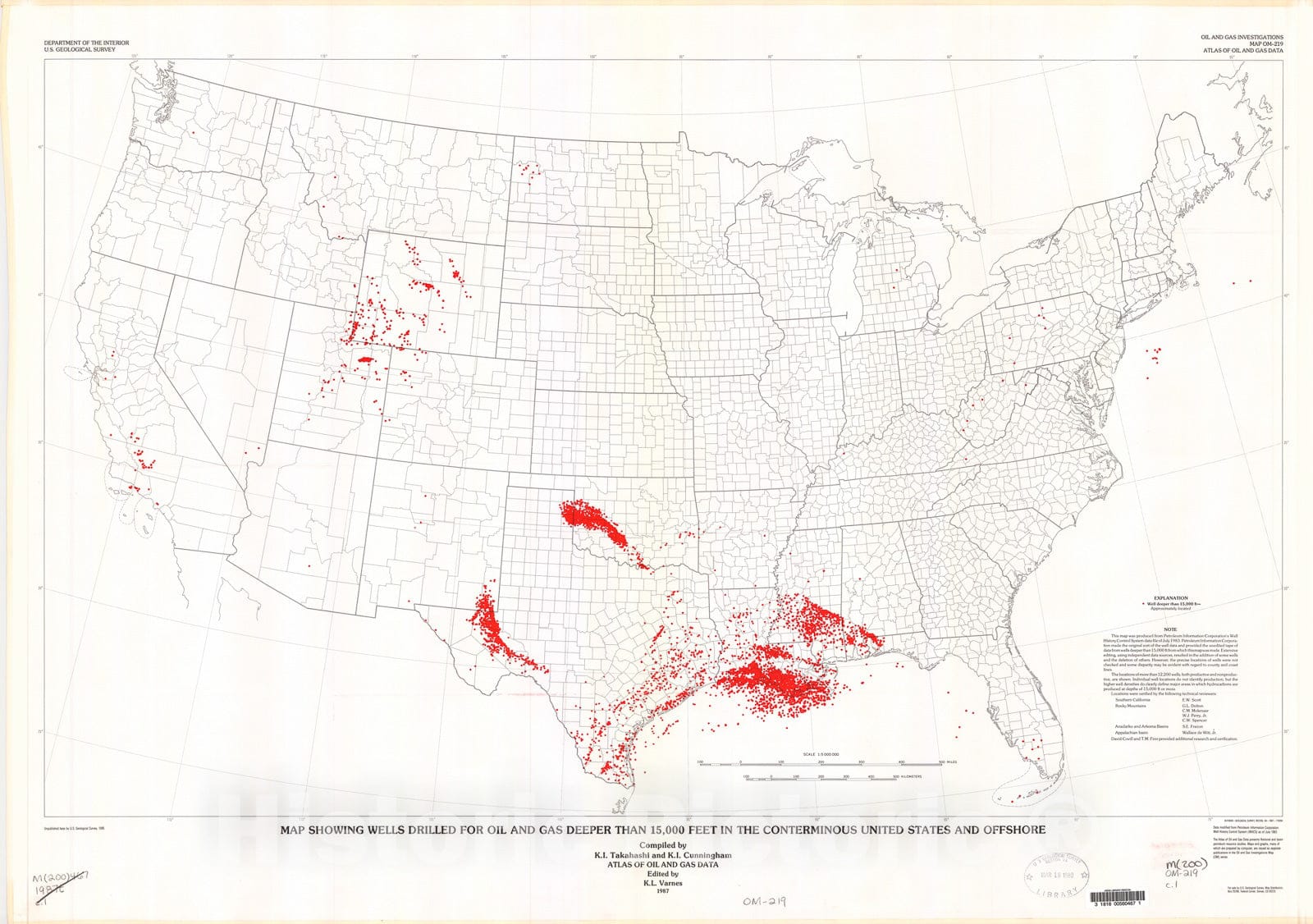 Map : Map showing wells drilled for oil and gas deeper than 15,000 feet in the conterminous United States and offshore, 1987 Cartography Wall Art :