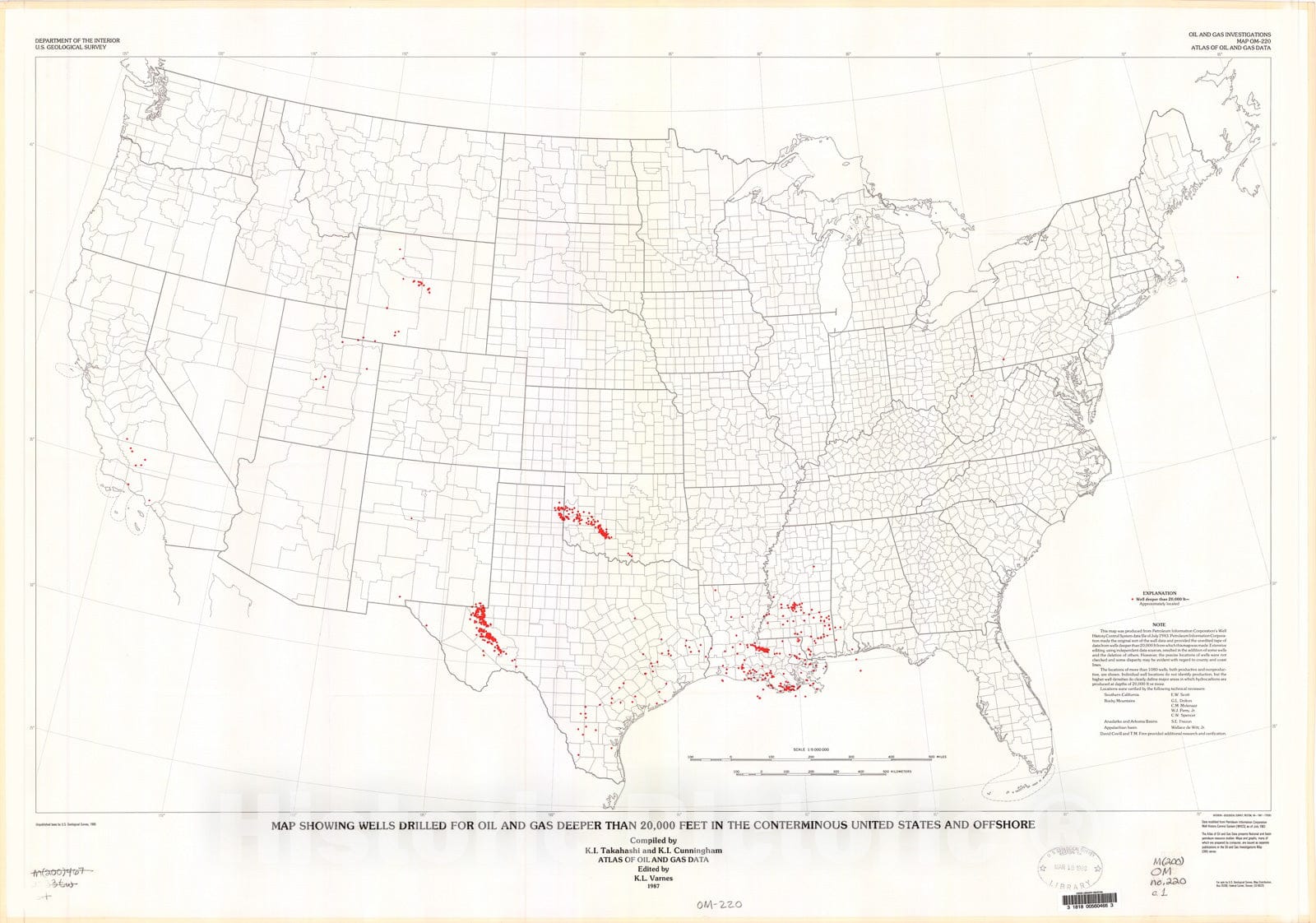 Map : Map showing wells drilled for oil and gas deeper than 20,000 feet in the conterminous United States and offshore, 1987 Cartography Wall Art :