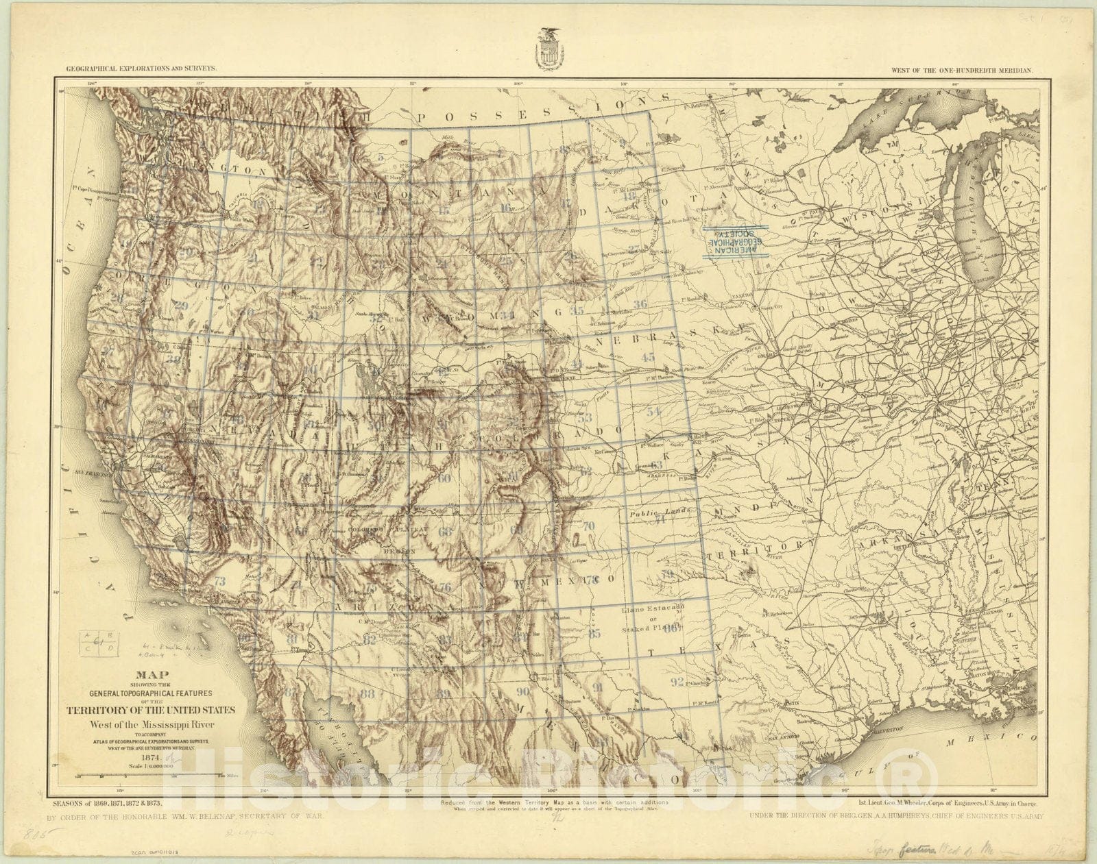Map showing the general topographical features of the territory of the United States west of the Mississippi River to accompany atlas of geographical explorations and surveys west of the one-hundredth meridian, 1874