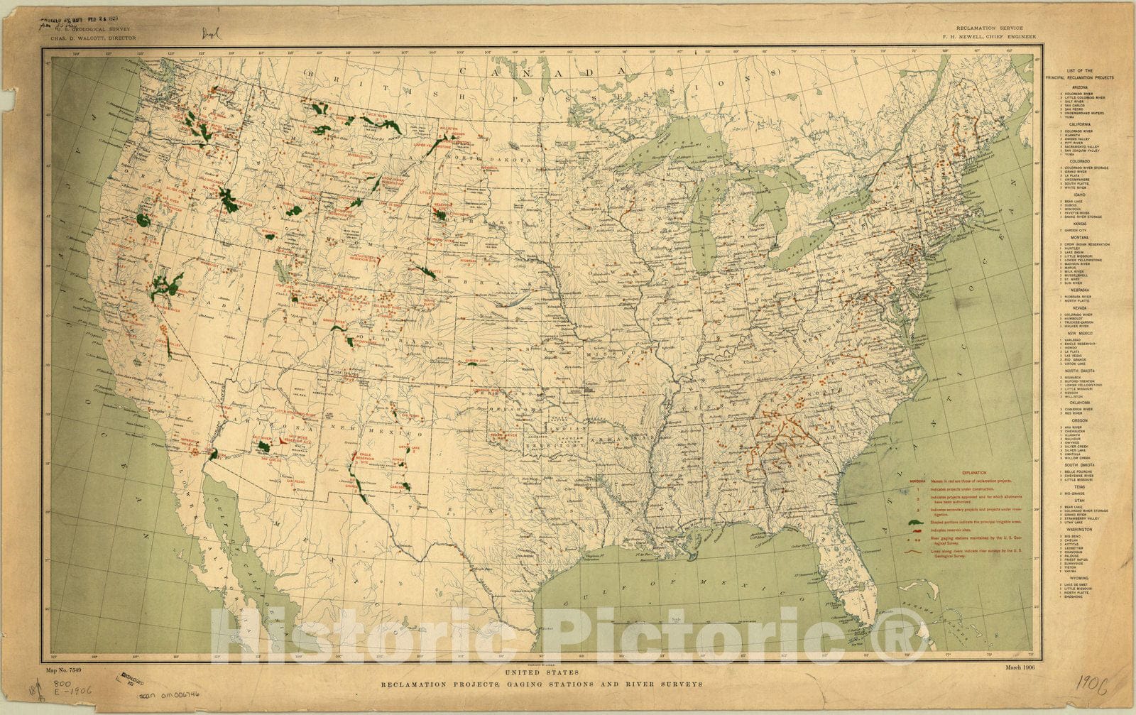 Map : United States 1906, United States, reclamation projects, gaging stations and river surveys , Antique Vintage Reproduction