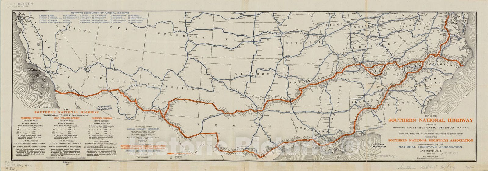 Historic Map : United States 1915, Map of the Southern National Highway [in the United States] : including its Gulf-Atlantic Division (borderland route) , Antique Vintage Reproduction