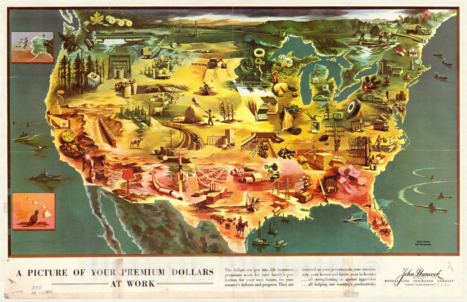 • Map : United States 1952, A picture of your premium dollars at work , Antique Vintage Reproduction