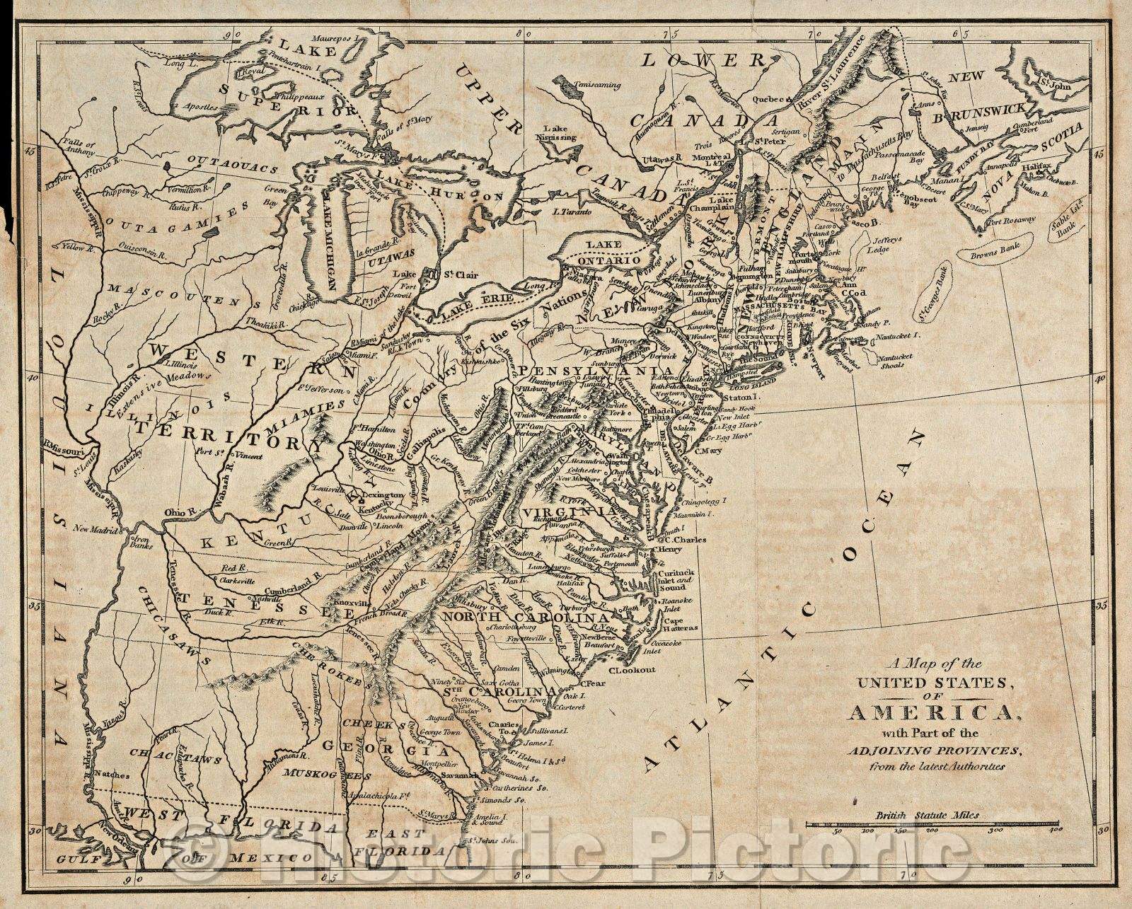 Historic Map : A Map of the United States, of America, with Part of the Adjoining Provinces, from the latest Authorities, c. 1790 , Vintage Wall Art