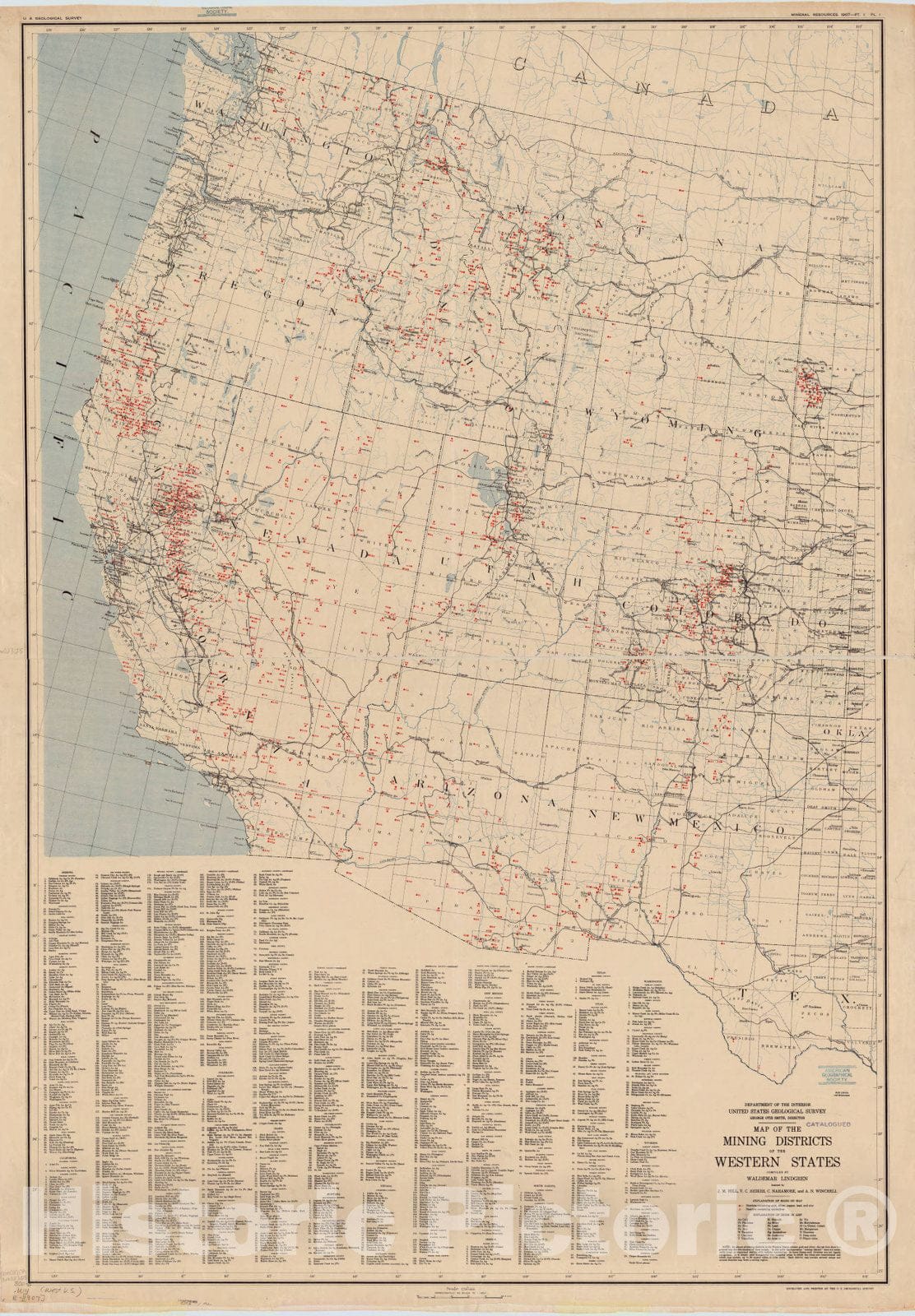 Map : United States, western 1907, Map of the mining districts of the western United States, Antique Vintage Reproduction