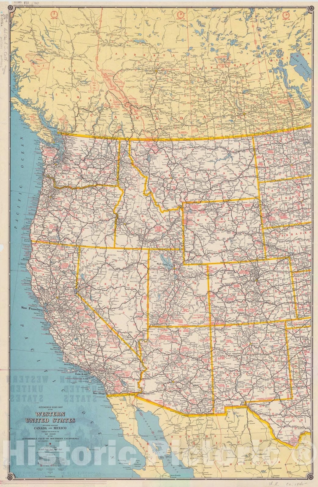 Map : United States, western 1946 2, Automobile road map of the western United States including adjacent Canada and Mexico , Antique Vintage Reproduction