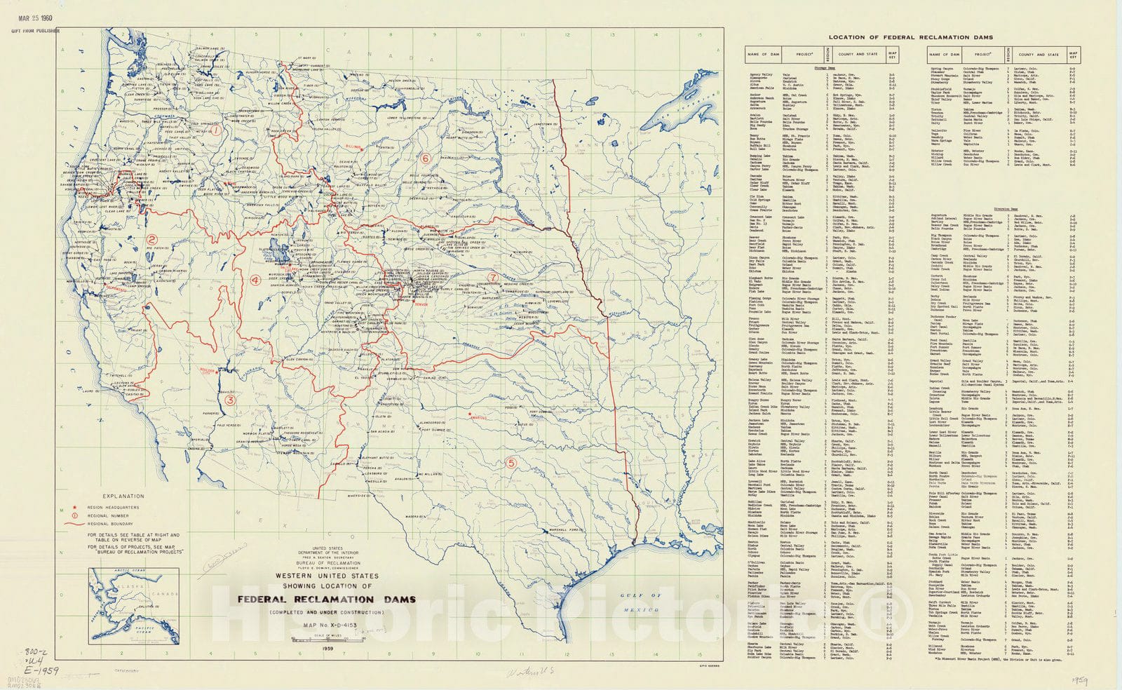 Map : United States, western 1959, Western United States showing location of federal reclamation dams (completed and under construction), Antique Vintage Reproduction