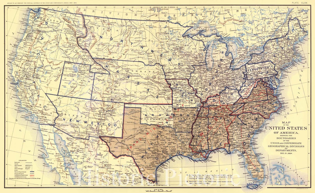 Historic Map : 1864 Map of the United States of America showing the Boundaries of the Union and Confederate Geographical Divisions and Departments : Vintage Wall Art