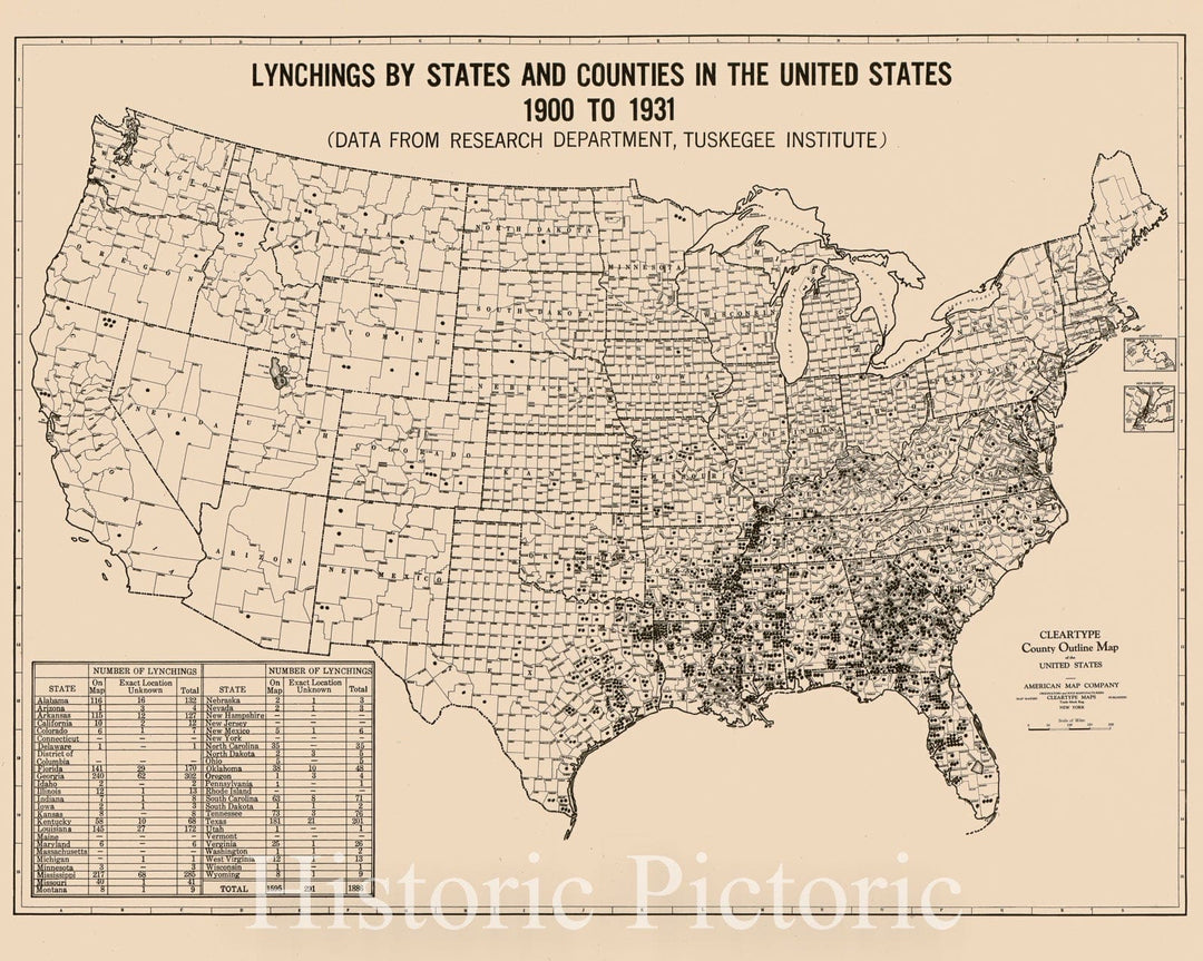 Historic 1931 Map - Lynchings by States and Counties in The United States, 1900-1931 : (Data from Research Department, Tuskegee Institute)