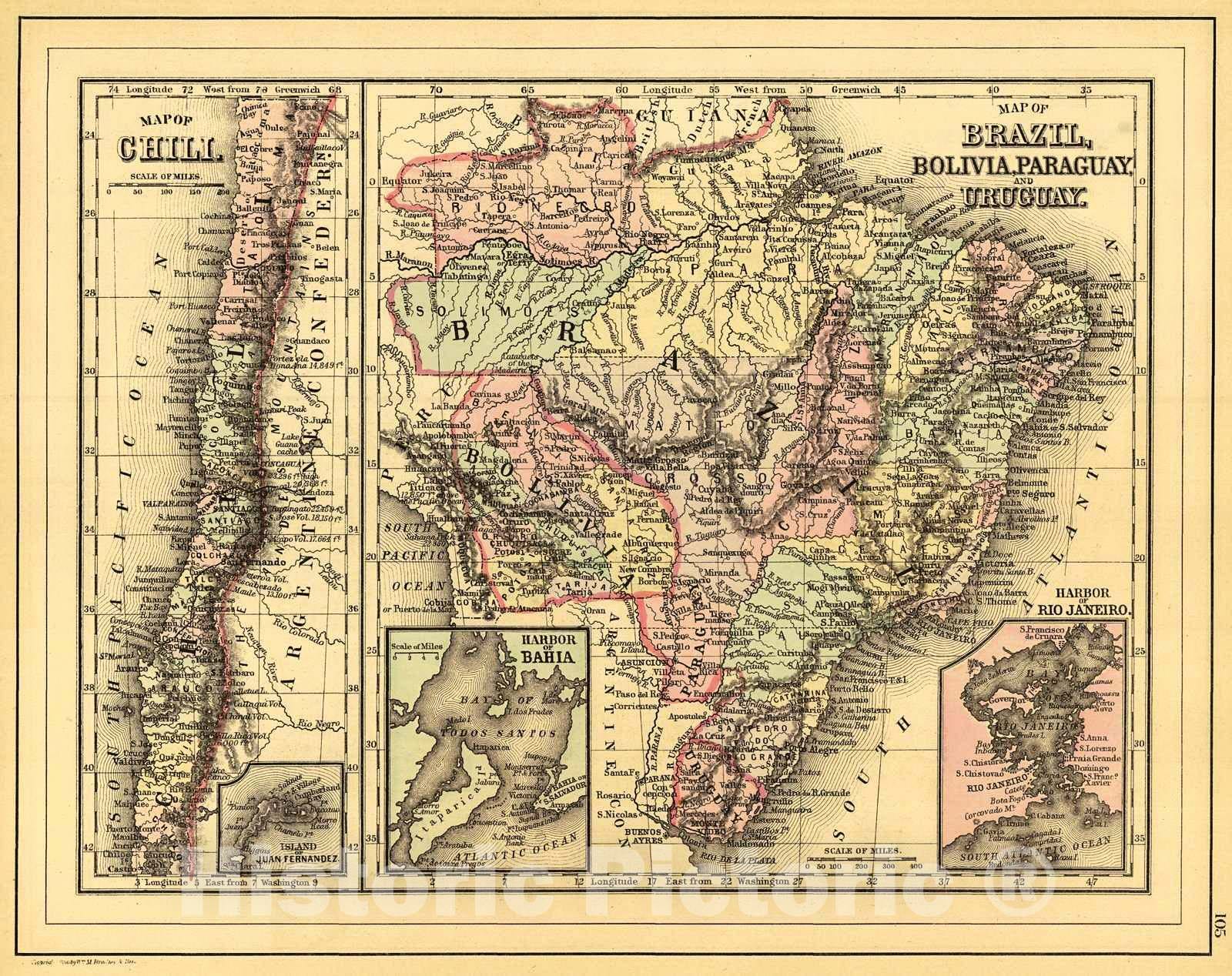 Vintage Map | 1887 Map of Chili, Map of Brazil, Bolivia, Paraguay and Uruguay | Mitchell Jr., S. Augustus