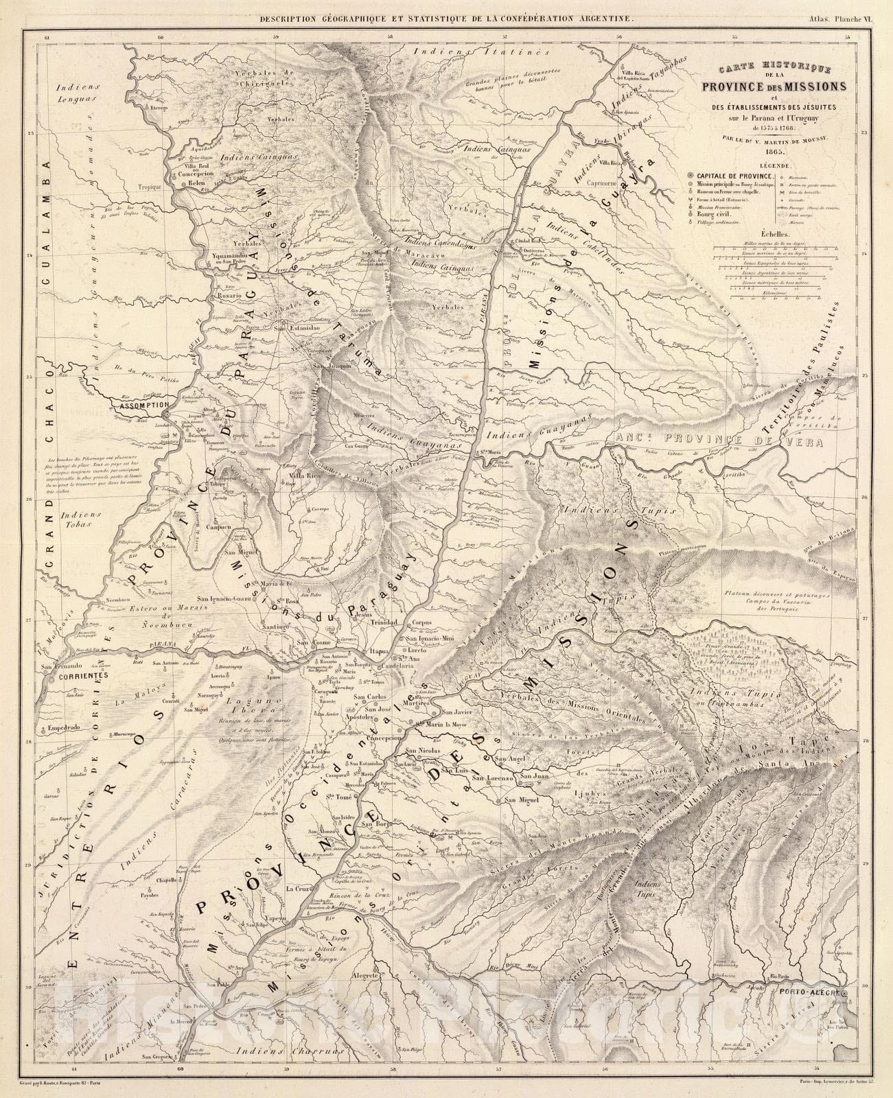 Historic Map : Argentina; Uruguay, , South America 1873 Carte hist, Prov. des Missions, etabl. Jesuites, Parana et l'Uruguay, 1575-1768. , Vintage Wall Art