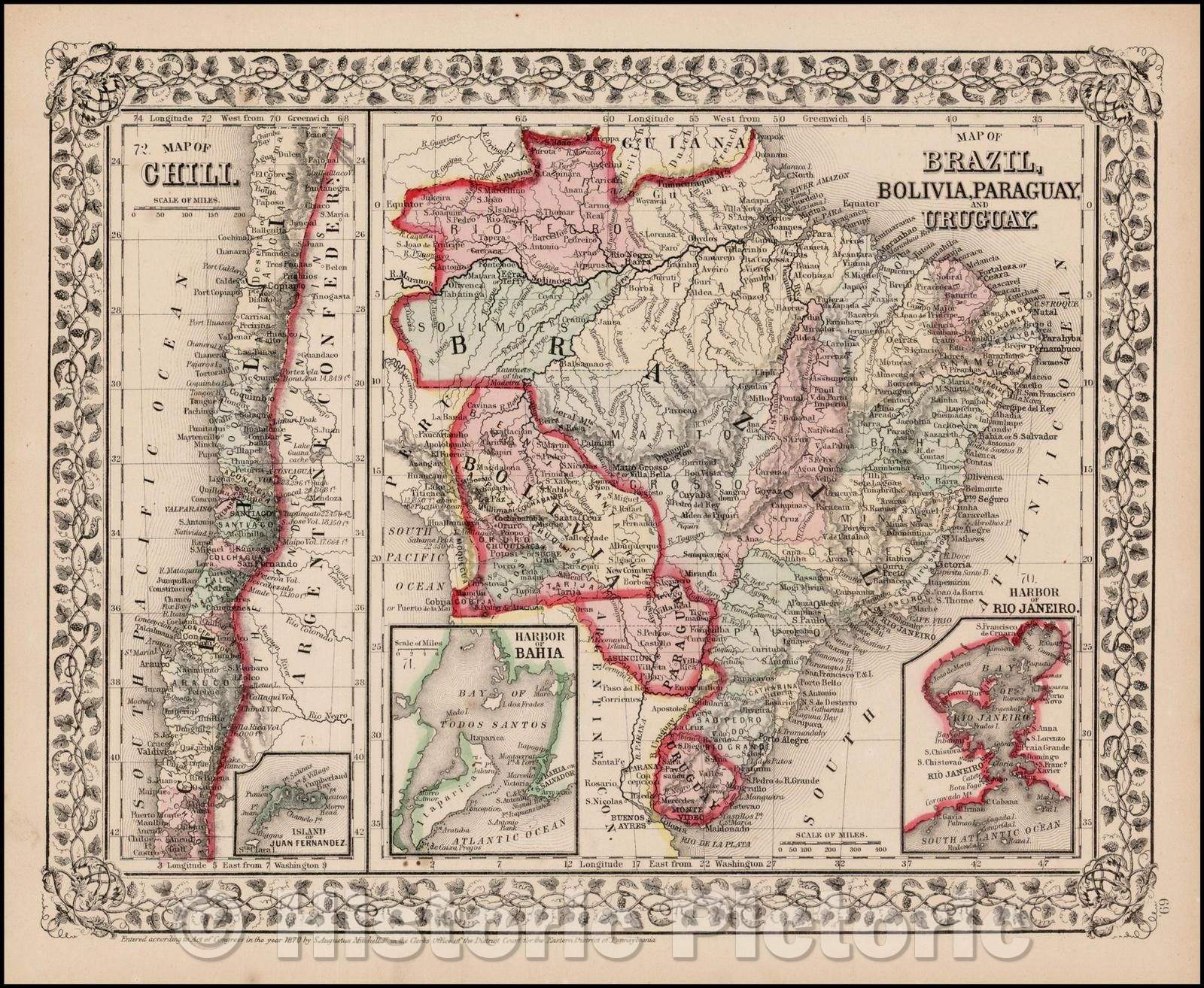 Historic Map - Map Of Brazil, Bolivia, Paraguay, And Uruguay With [Chili], 1870, Samuel Augustus Mitchell Jr. v2