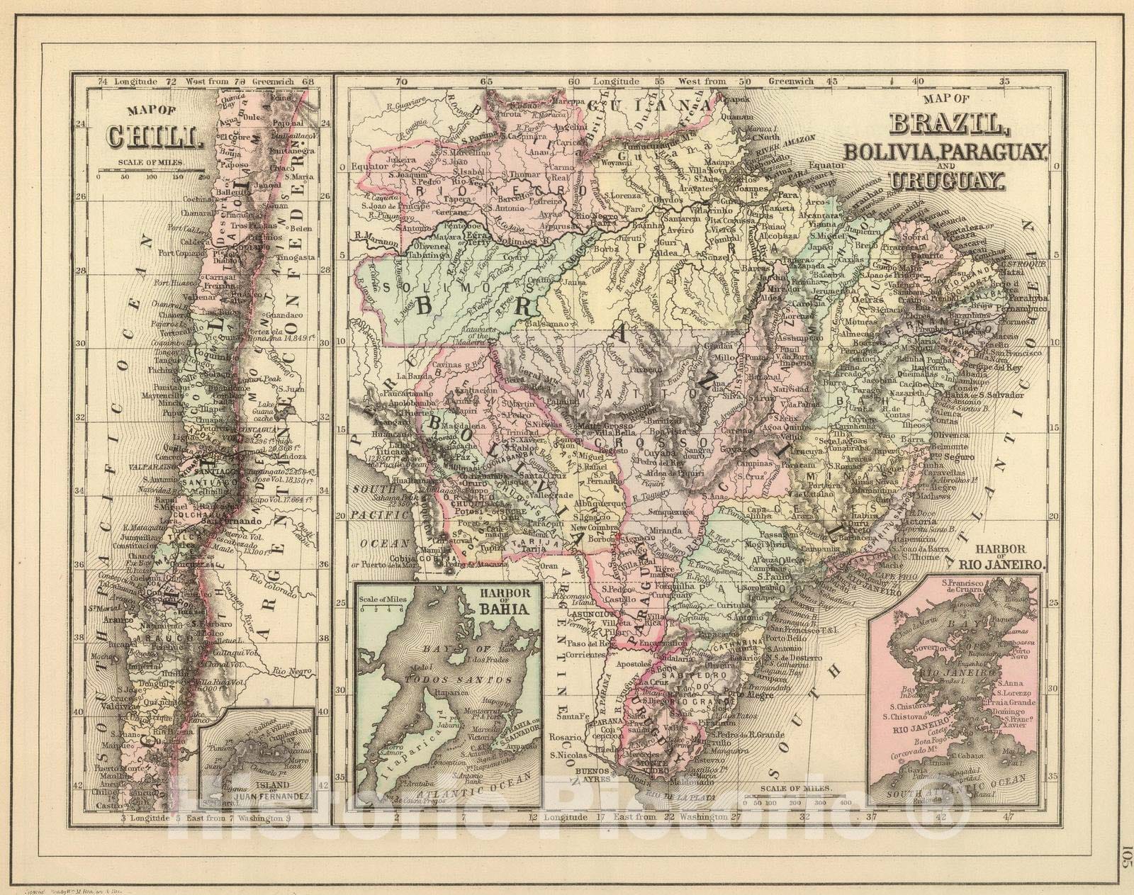 Brazil; Chile, , South America 1886 Brazil, Bolivia, Paraguay, Uruguay. v2 , Vintage Wall Art