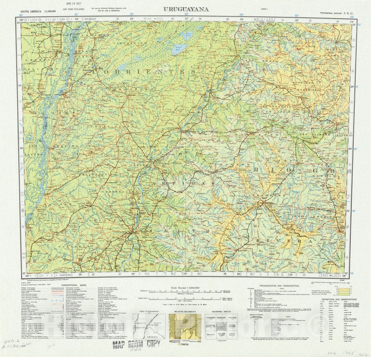 • .Map : Uruguayana, Argentina 1948, South America 1:1,000,000 Uruguayana , Antique Vintage Reproduction