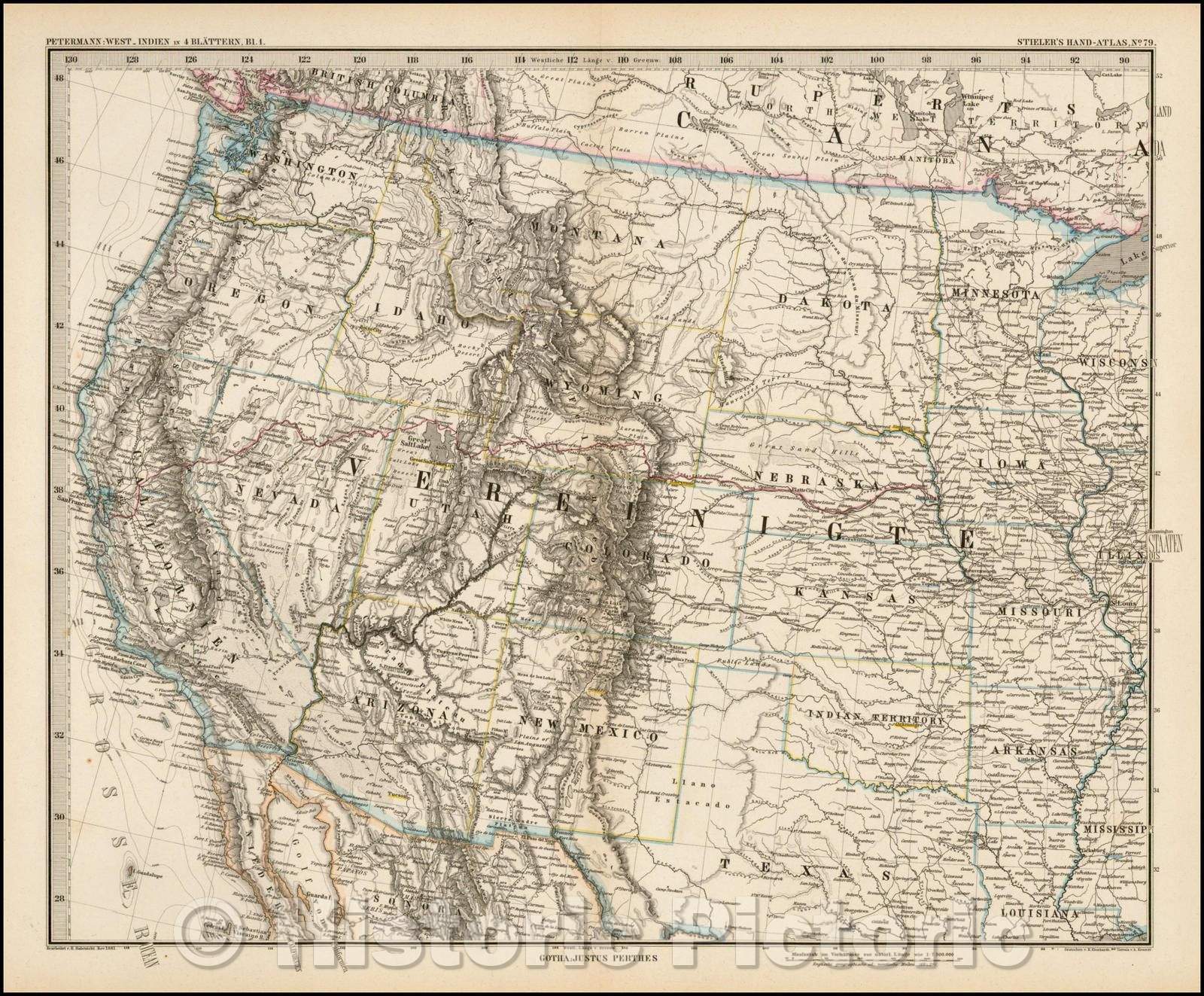 Historic Map - Vereinigte Staaten, Blattern 1 (Western United States) / Map of Region illustrating the great precision in Stieler's work, 1882, Adolf Stieler - Vintage Wall Art