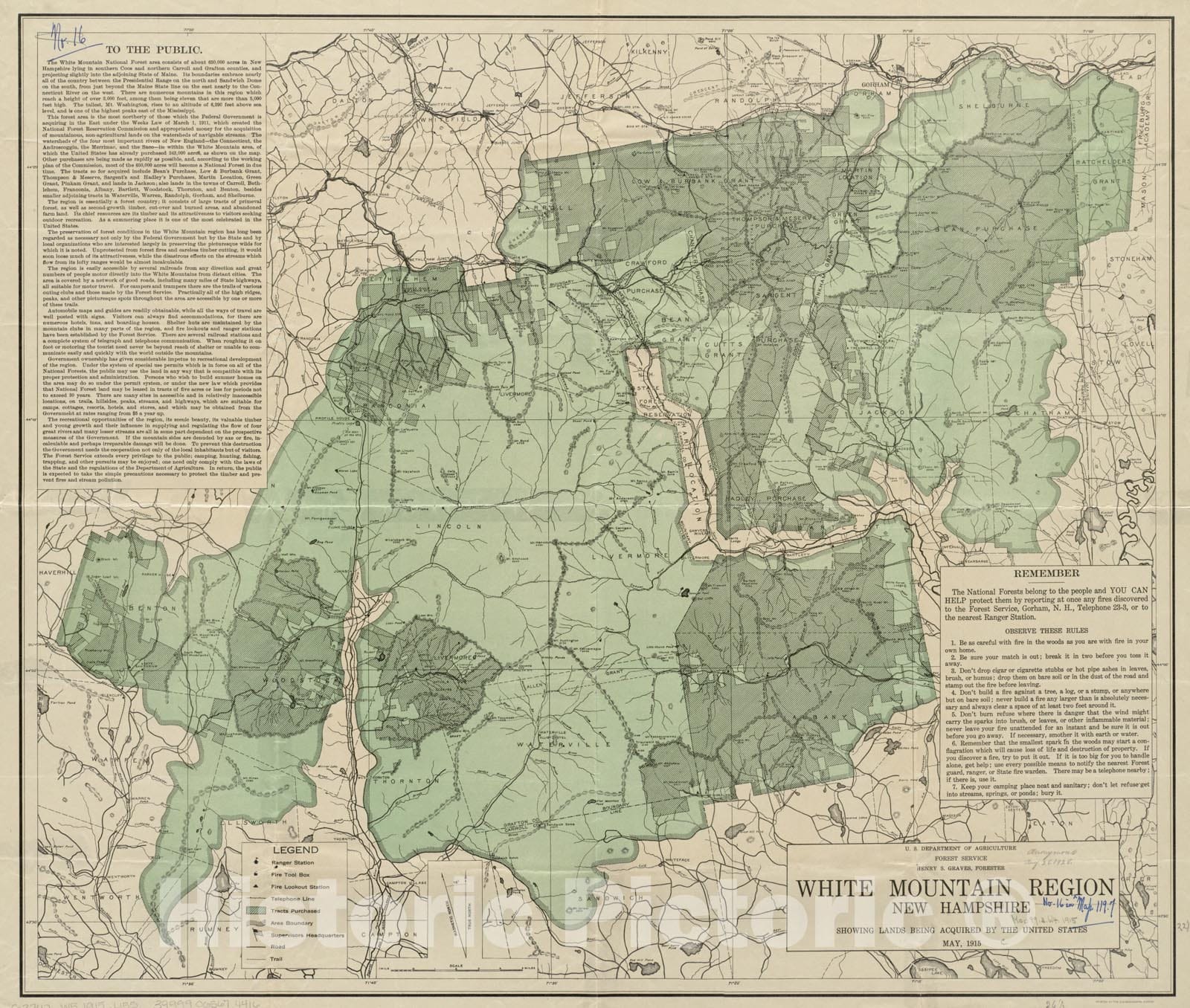 Historical Map, 1915 White Mountain Region, New Hampshire : Showing Lands Being Acquired by The United States, Vintage Wall Art