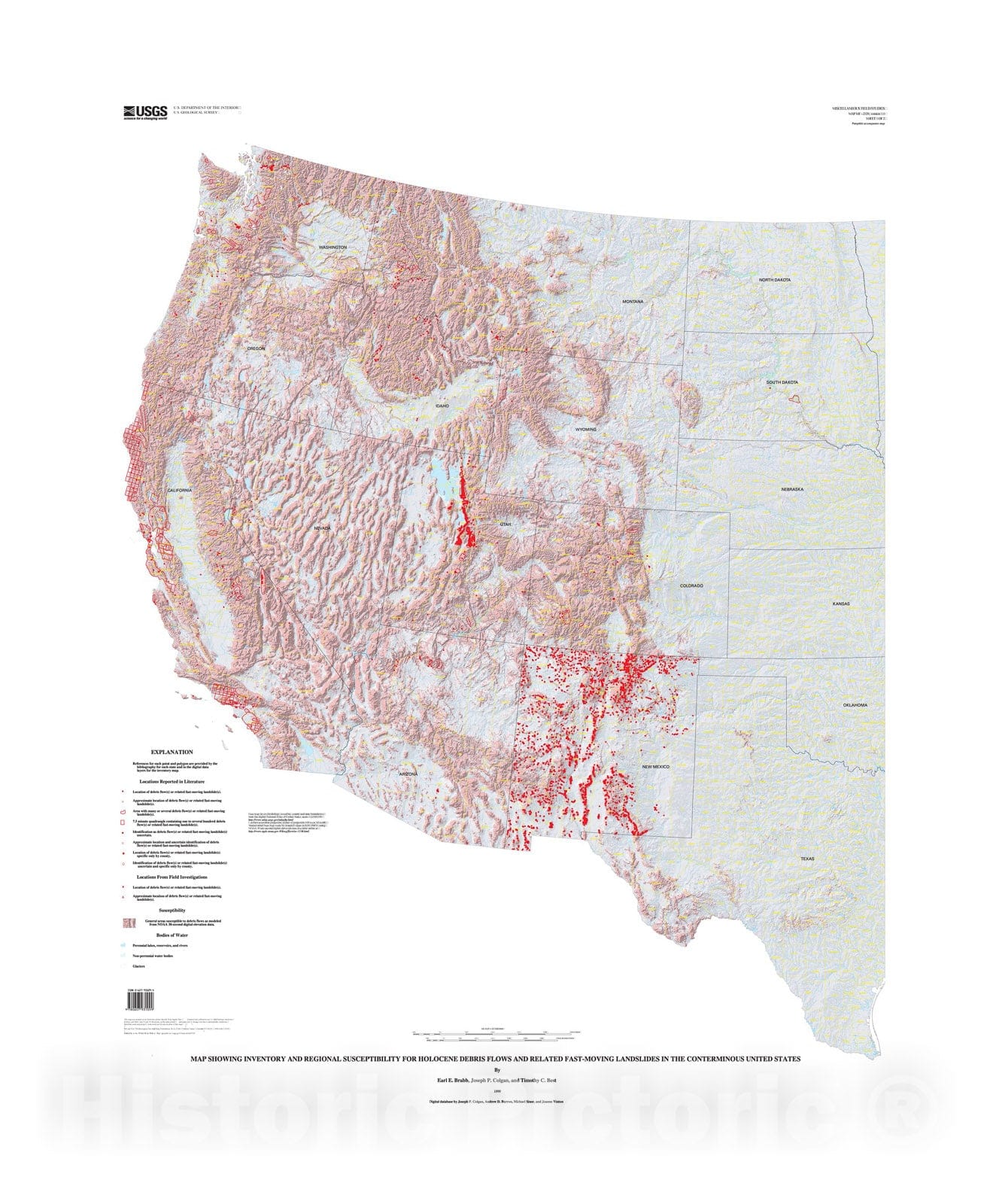 Map : Map showing inventory and regional susceptibility for Holocene debris flows, and related fast-moving landslides in the conterminous United States, 1999 Cartography Wall Art :
