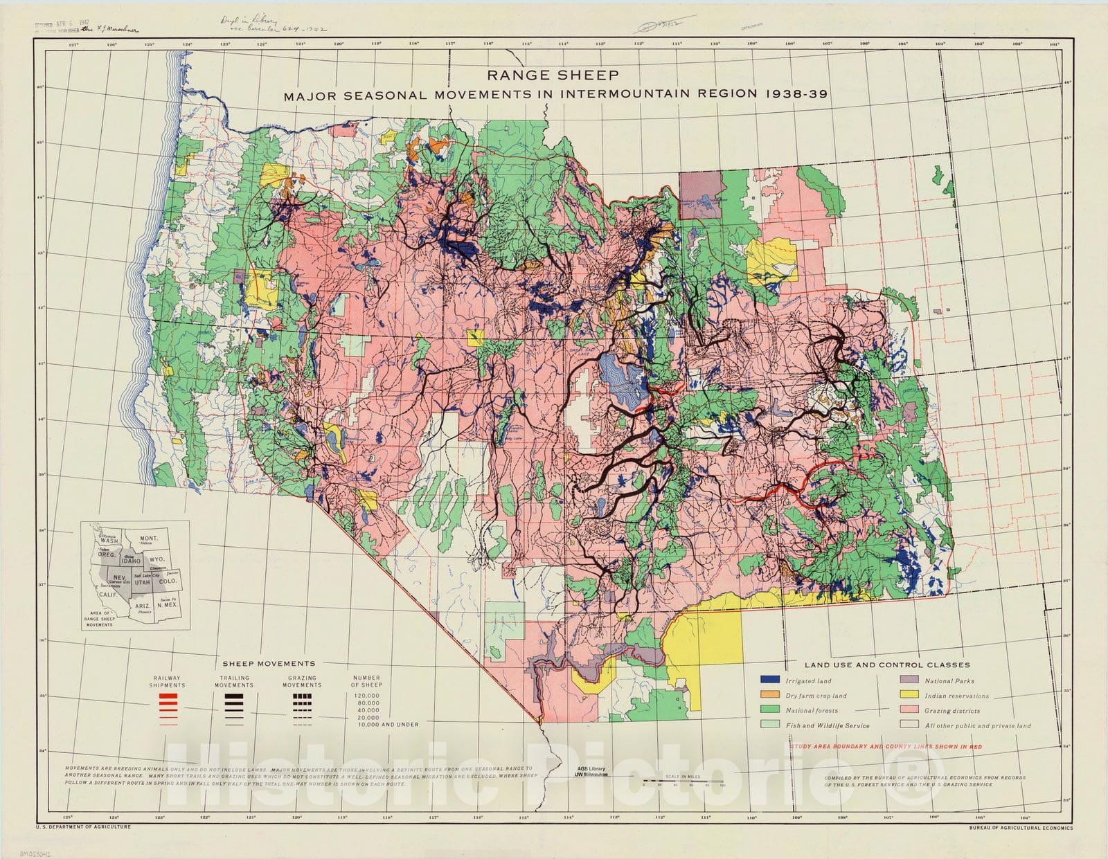 Map : United States, western 1939 2, Range sheep, major seasonal movements in Intermountain Region, 1938-39 , Antique Vintage Reproduction