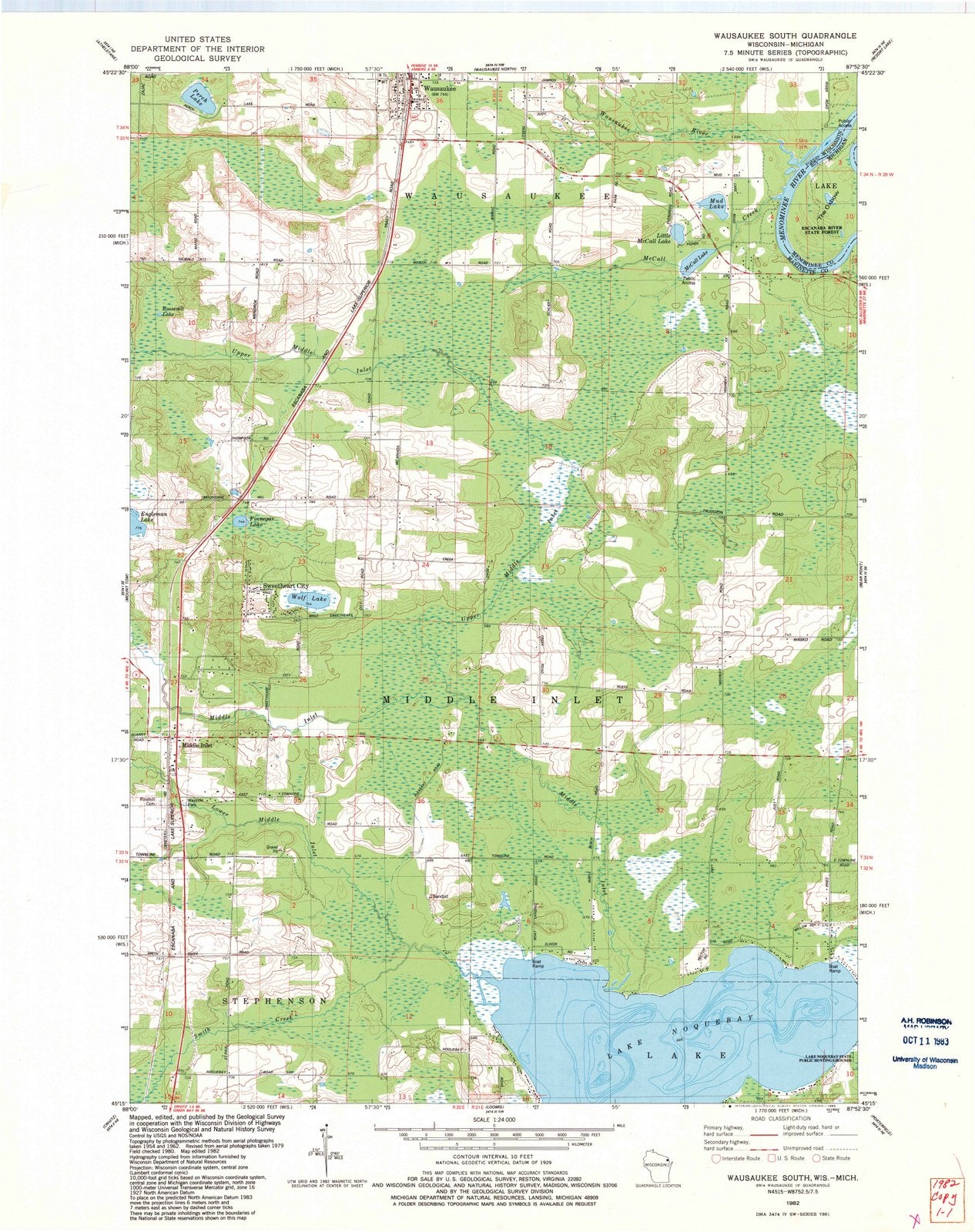 1982 Wausaukee South, WI - Wisconsin - USGS Topographic Map