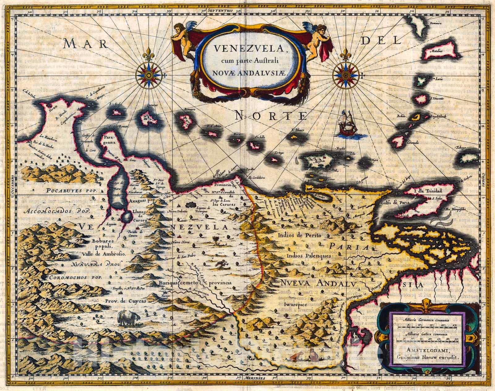 Vintage Map | 1647 Venezuela, cum parte Australi novae Andalusaie | Bleau, Willem Janzoon
