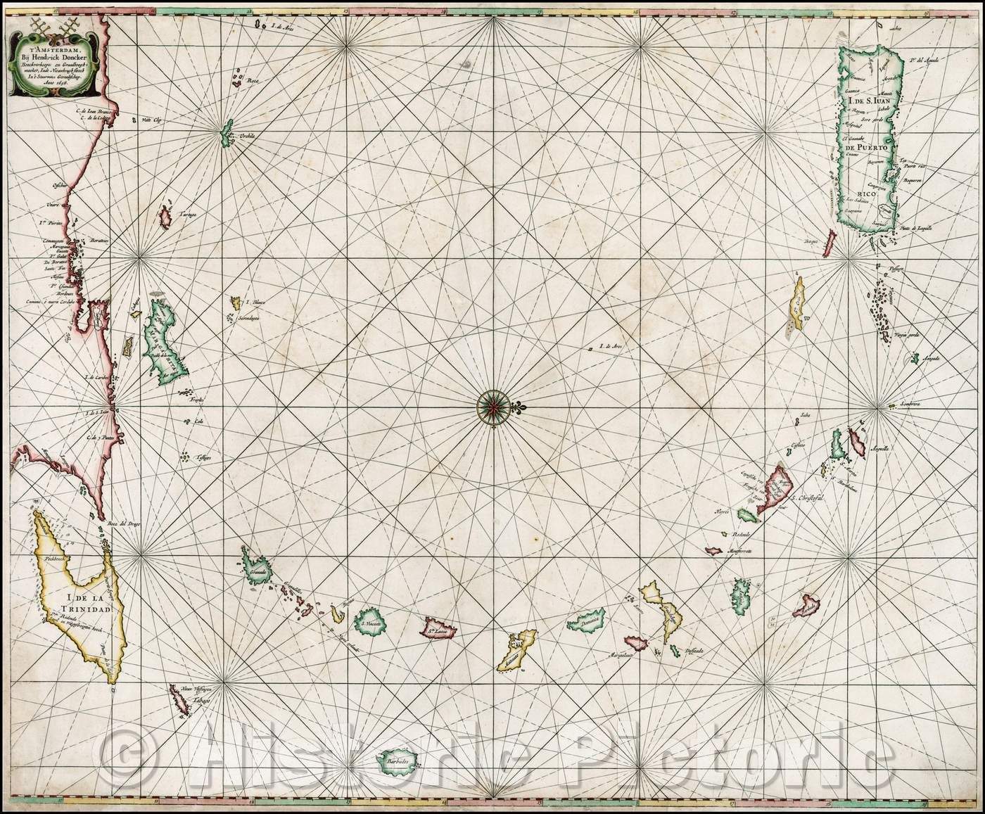 1658 Chart of the Antilles, Puerto Rico to Trinidad and Venezuelan Coastline, 1658, Henrdick Doncker