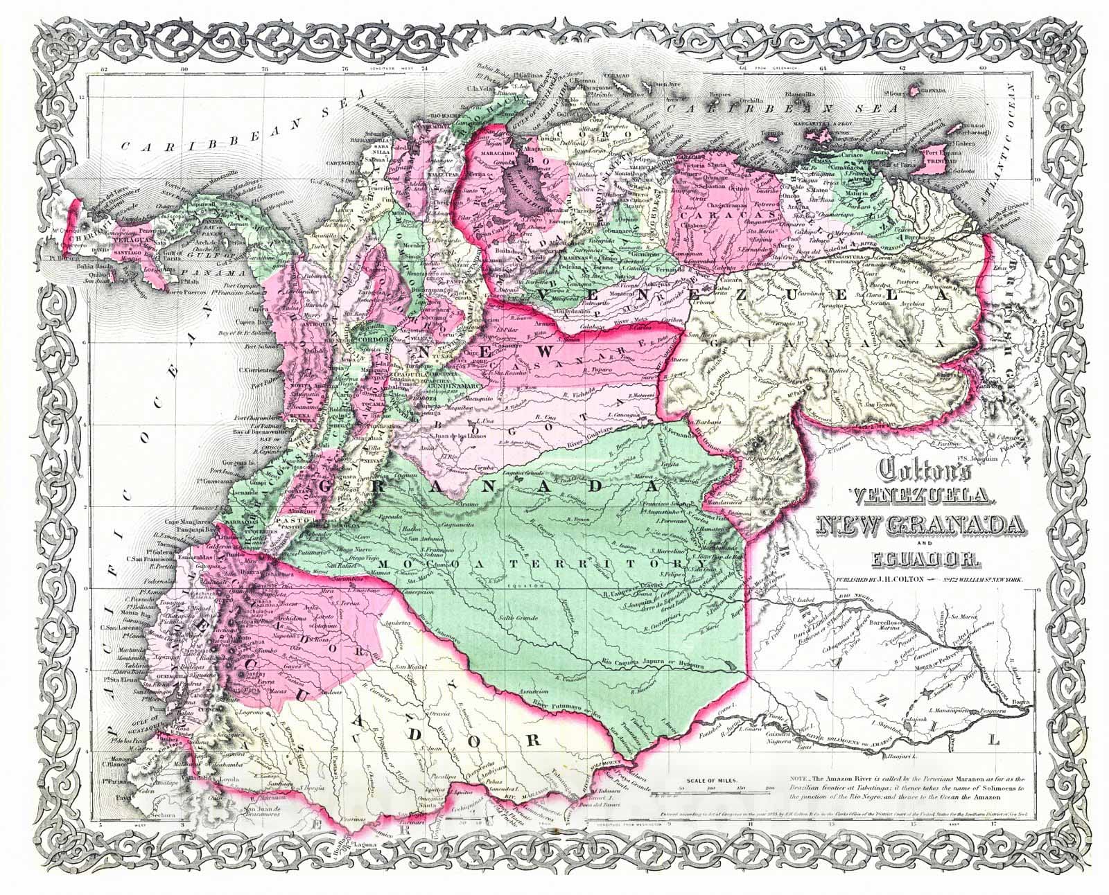 Vintage Map | 1855 Colton's Venezuela, New Granada and Ecuador |