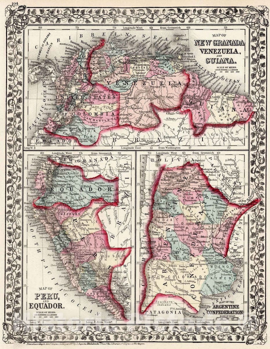 Historic Map : 1877 Map of New Granada, Venezuela and Guiana; Map of Peru and Equador ; Map of the Argentine Confederation - Vintage Wall Art