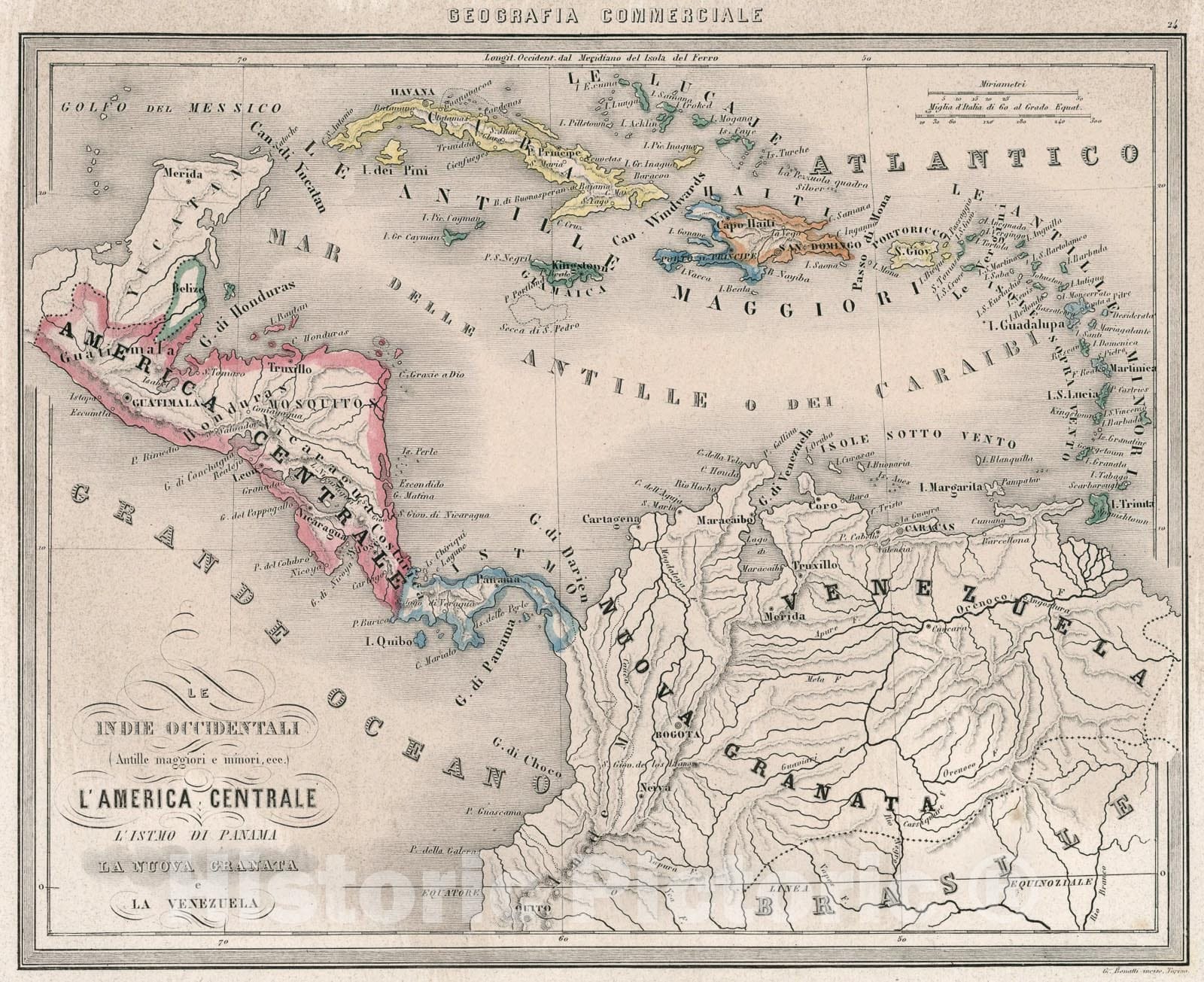 Historic Map : 24. Le Indie Occidentali (Antille maggiori e minori, ece.) LAmerica Centrale. LIstmo di Panama. Le Nuova Granata. La Venezuela., 1858, Vintage Wall Art
