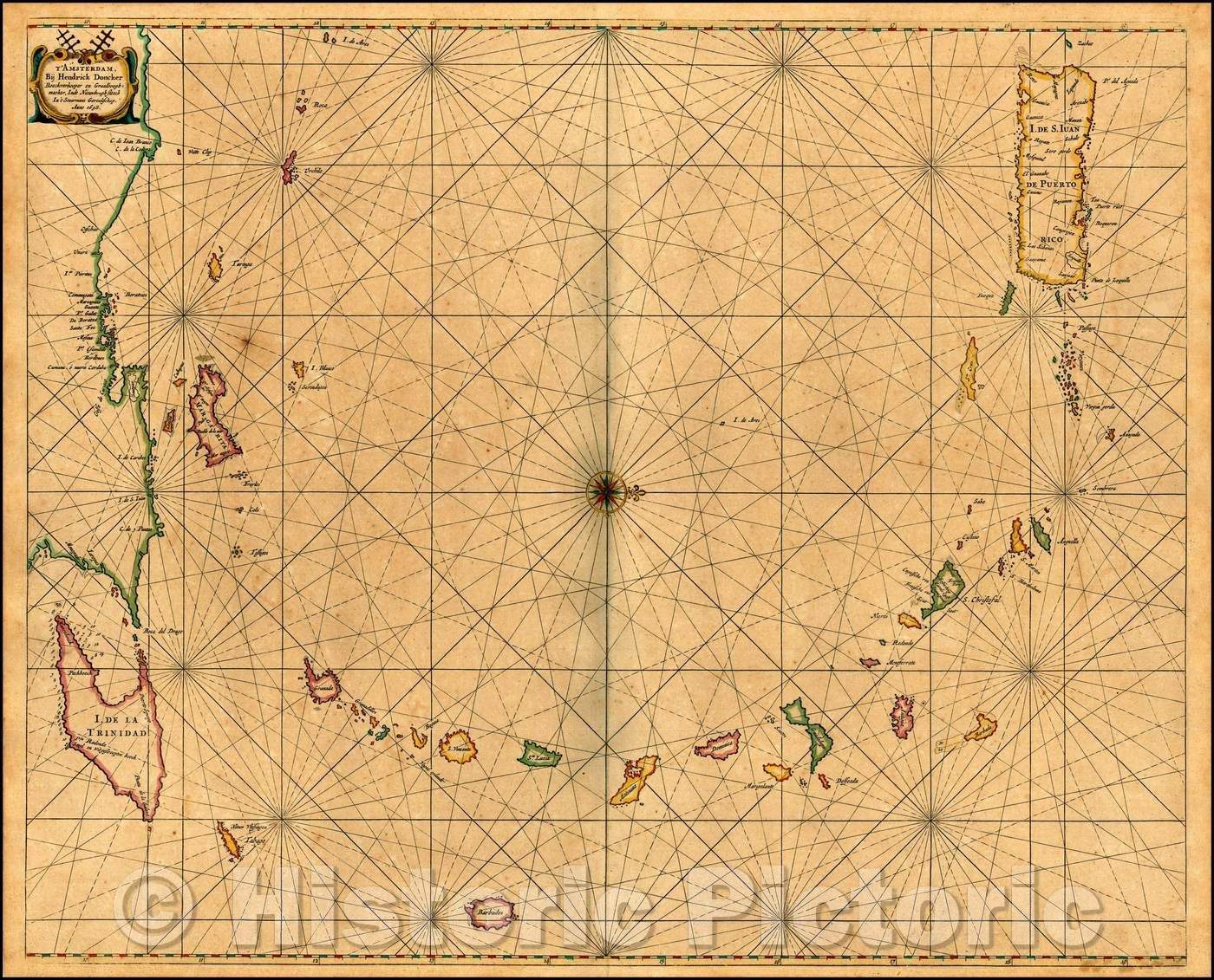 Historic Map - Antilles (Puerto Rico to Trinidad and Venezuelan Coastline), 1658, Henrdick Doncker - Vintage Wall Art