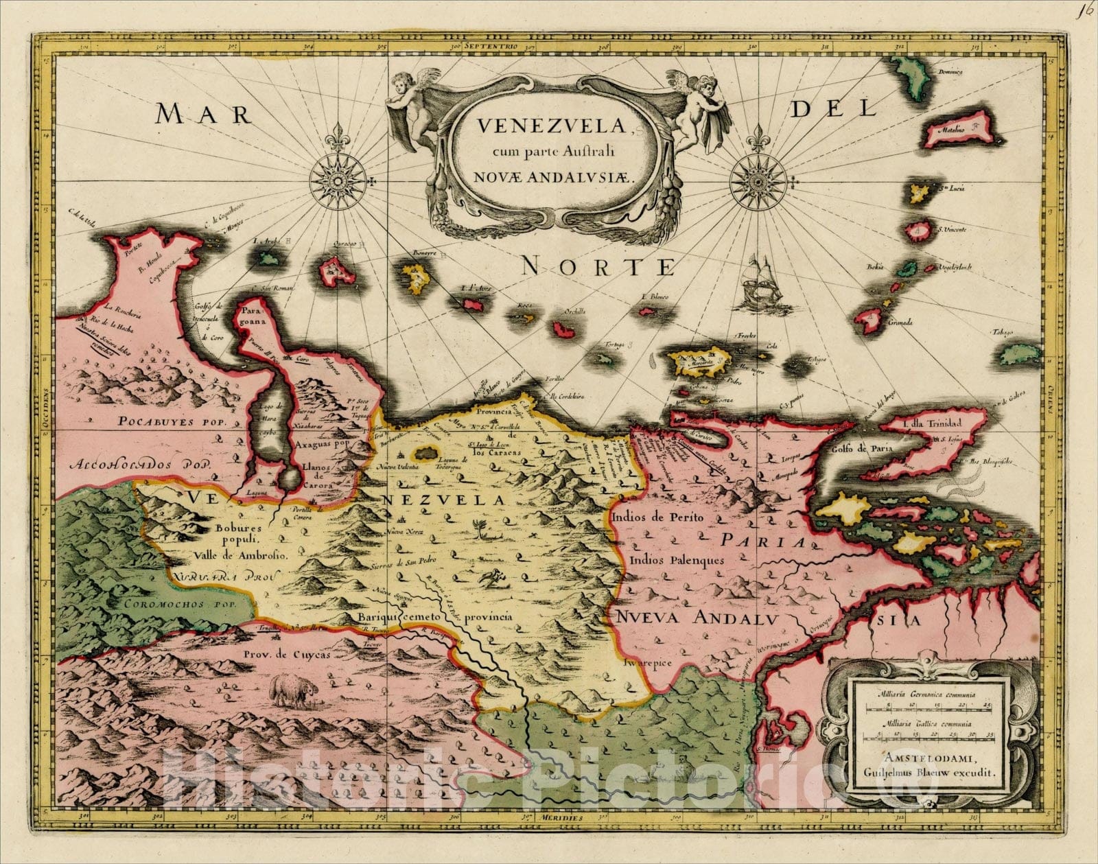 • .Historic Map : Venezuela cum parte Australi Novae Andalusiae, 1680, , Vintage Wall Art