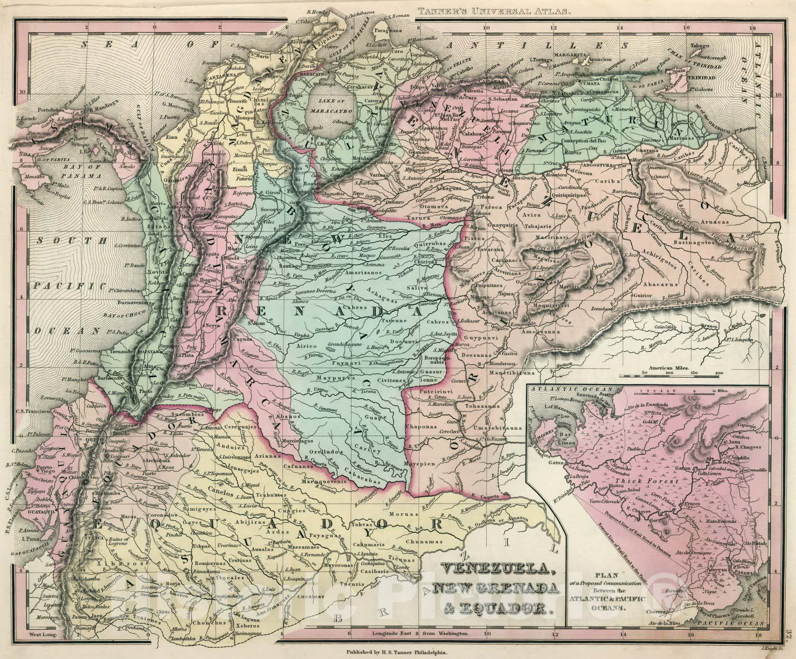 Venezuela, New Grenada & Equador (Ecuador). (inset) Plan of a Proposed Communication between the Atlantic and Pacific Oceans. | Tanner's Universal Atlas. No. ... of a New and Elegant Universal Atlas ... Constructed from the Most Recent and Authentic Documents by H.S. Tanner ... Philadelphia: Published by the Author, 144 Chestnut Street. (1833-) 1836. Subscription Price $1.00 a Number - separate Numbers $1.50 each. (parts 1-15 of the Universal Atlas, lacking parts 7 and 13.) | 13 complete parts of 15 parts issued between 1833 and 1836. In the original blue printed wrappers. Has two of the three maps (France and Spain/Portugal, but not England) that Tanner instructs the binder to throw out in favor of larger versions published later in the series. Includes the important part number 15 which has the title page, author's notice, table of contents, index, and notice to the binder. It is unusual to find this atlas in the original parts, unbound. However,this was representative of how these maps were typically sold, rather than in a single bound set. Relief shown in hachures.