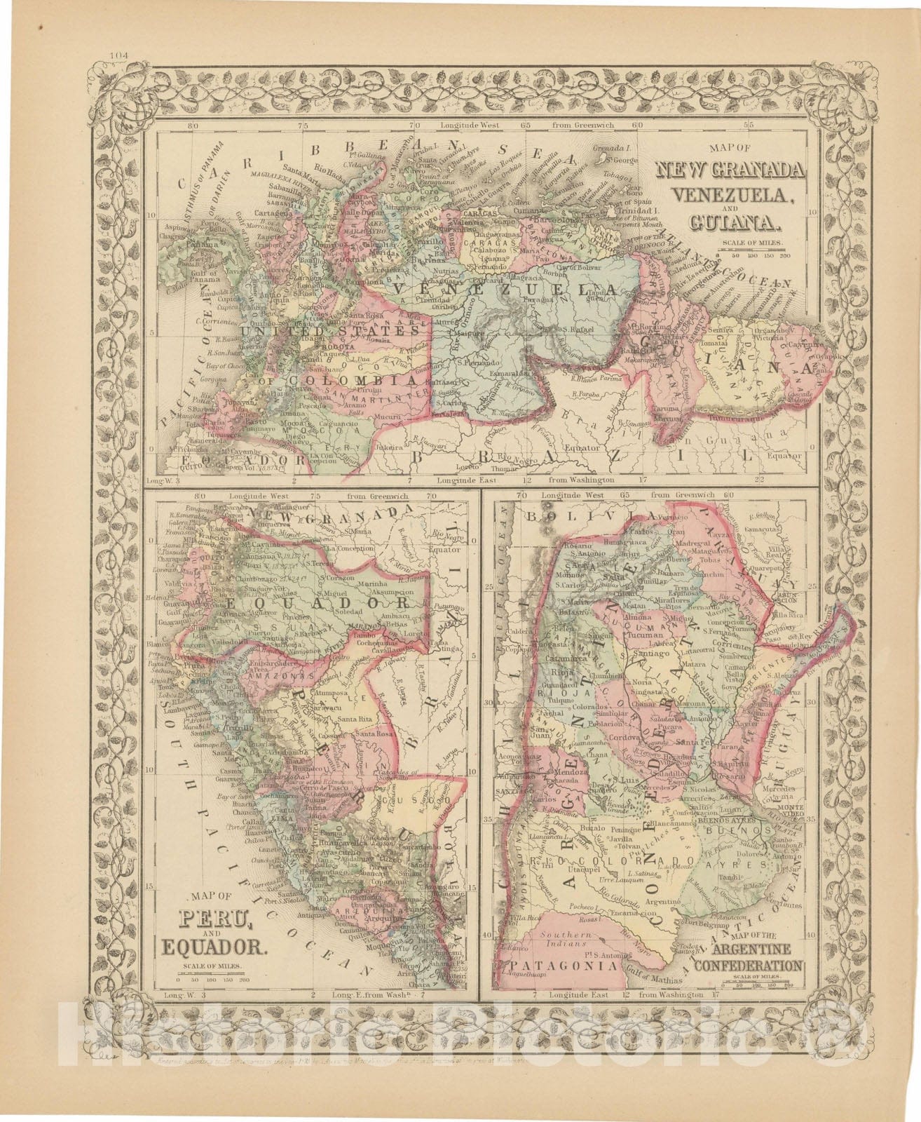 • .Historic Map : Venezuela & Colombia & Ecuador & Peru & Argentina & Guiana & Suriname 1882 , Mitchell's New General Atlas , Vintage Wall Art