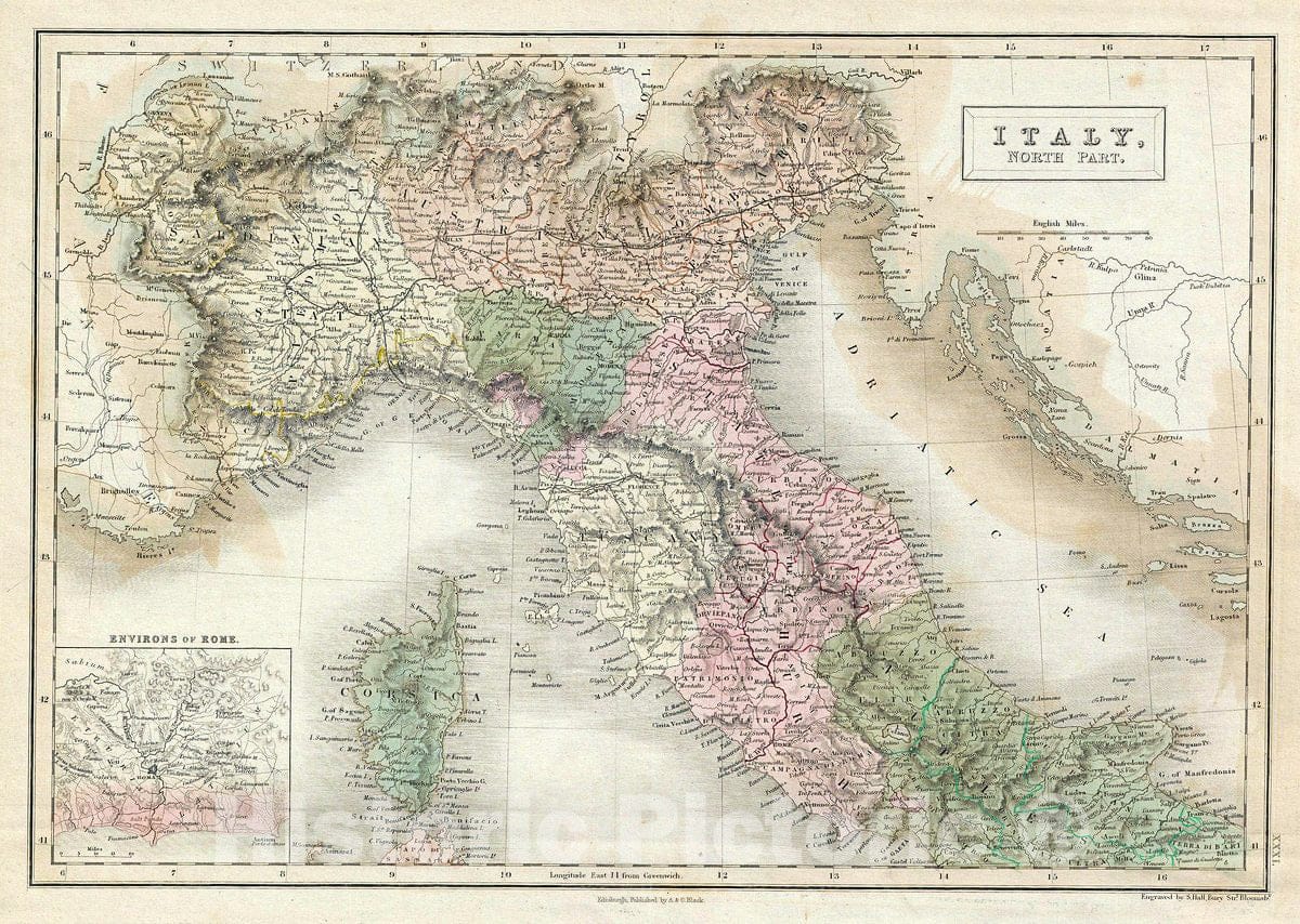 This is a fine example of Adam and Charles Black's 1851 map of northern Italy. The map covers the island of Corsica and Northern Italy, including the regions of Tuscany, Modena, Parma, the Sardinian States, Austrian Lombardy and the State of the Church. It also includes the northern extension of the Kingdom of Naples. An inset map in the lower left quadrant depicts the environs of Rome. As this map was being drawn, Italy was undergoing the process of Risorgimento, where the different city-states of the Italian Peninsula struggled for solidary as a single Italian nation. Throughout, the map identifies various cities, towns, rivers, mountain passes and an assortment of additional topographical details with relief shown in hachures. Map is hand colored in pink, green, blue and yellow pastels to define boundaries. This map was engraved by Sidney Hall and issued as plate no. in xin xin xI in the 1851 edition of Black's General Atlas of the World.