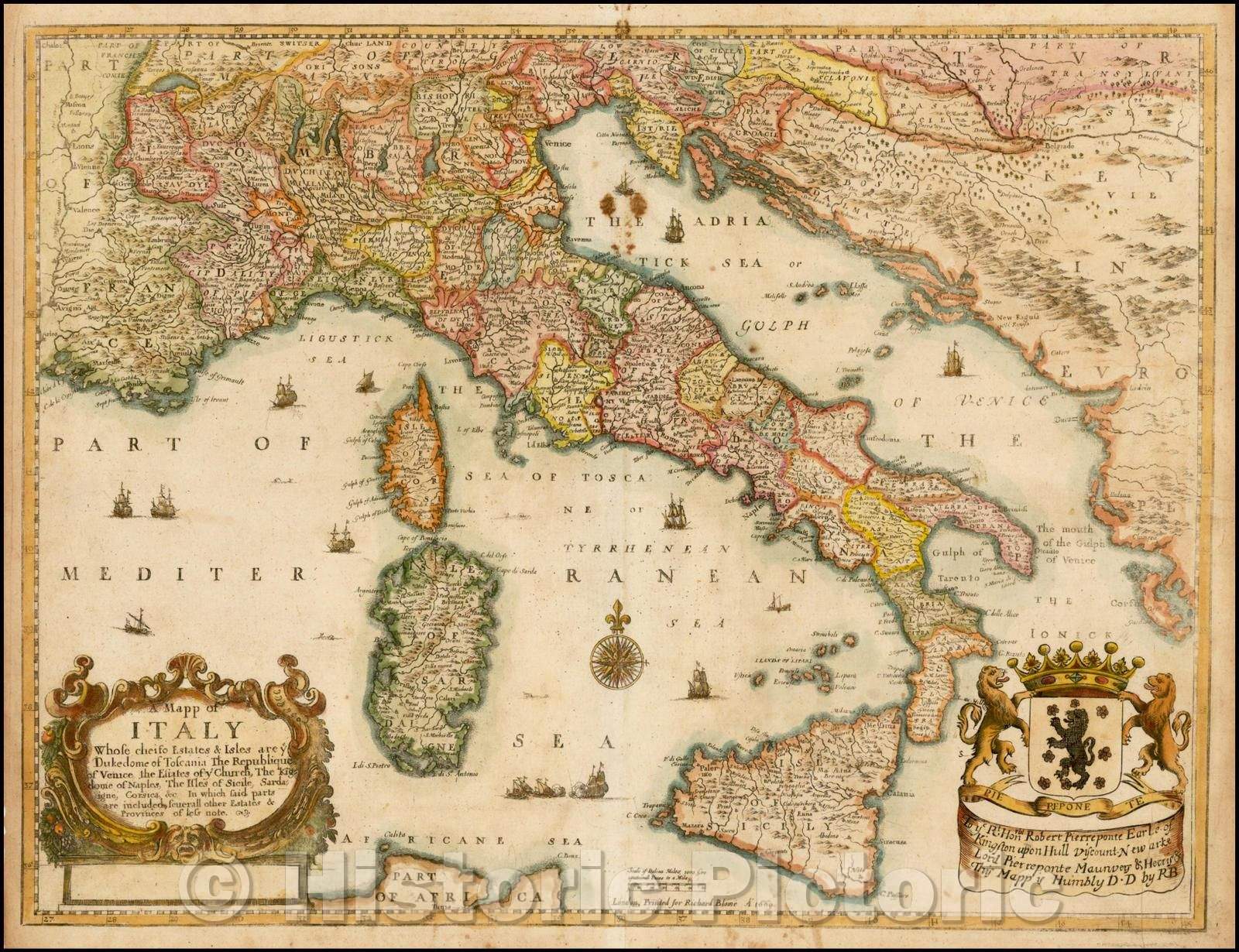 • .Historic Map - Italy whose cheife Estates & Isles are ye Dukedome of Toscania the Republique of Venice, the Estates of ye Church, The Kingdome of Naples, 1669 - Vintage Wall Art