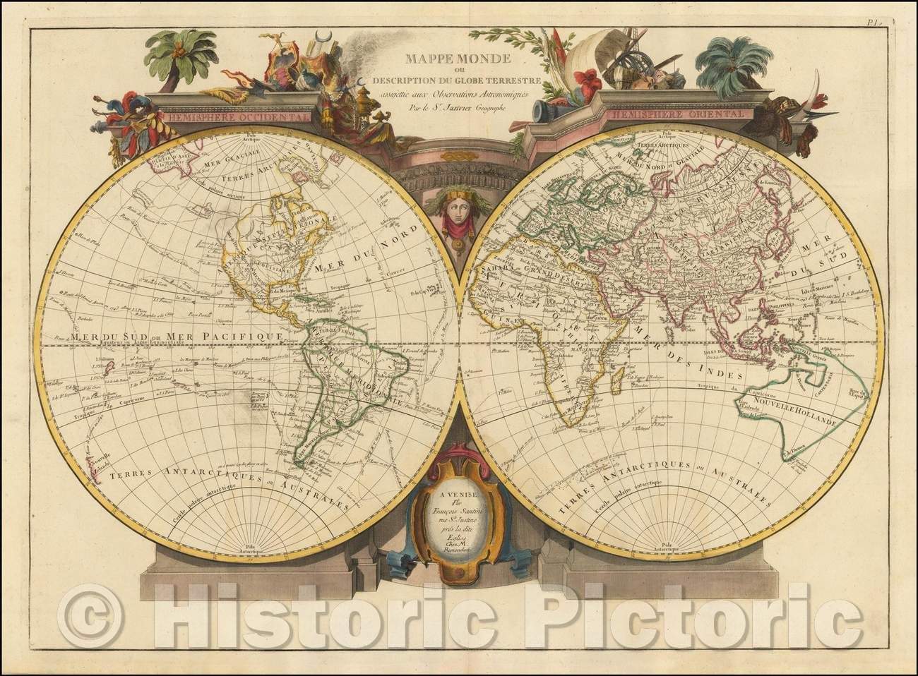 Historic Map - Mappe Monde ou Description Du Globe Terrestre assu/Double hemisphere Map of the World, published in Venice, 1776, Paolo Santini - Vintage Wall Art