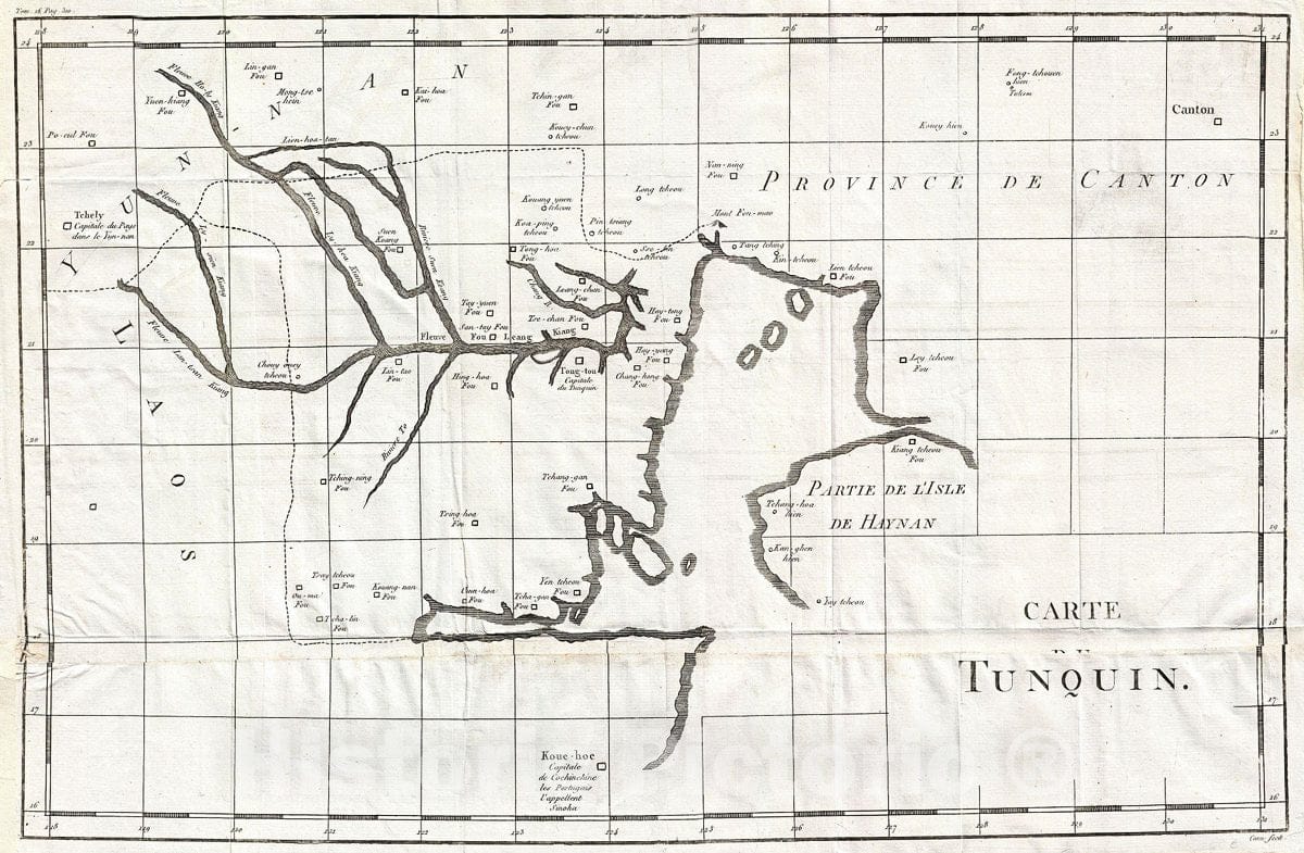 A very unsual 1781 map of northern Vietnam compiled from early Jesuit missionary reports. This unusual maps covers from Canton (Guangzhou, China) in the far northeast southwards as far as Koue-hoe (Hue, Vietnam, ancient capital of Cochinchine), and westwards as far as Tchely (Kunming, Yunna, China). The map includes part of Hainan Island, Ha Long Bay, the South China Sea, and various rivers systems leading into the mountainous interior of modern day Vietnam. Tong-Tou, most likely the modern city of Hanoi, is noted. Numerous cities, villages, and ethnic groups are noted, as are the borders the Kingdom of Tonkin. The map was engraved by Jean Dominique Etienne Canu in Paris, France, for issue in Yves Mathurin Marie Treaudet de Querboeuf's Lettres Edifiantes et Curieuses.