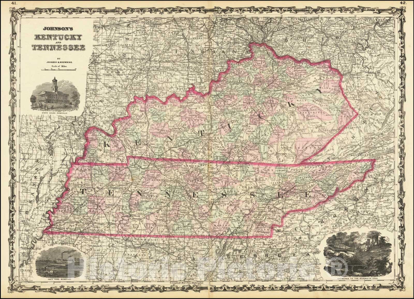 Historic Map : Johnson's Kentucky and Tennessee, 1861, Vintage Wall Art