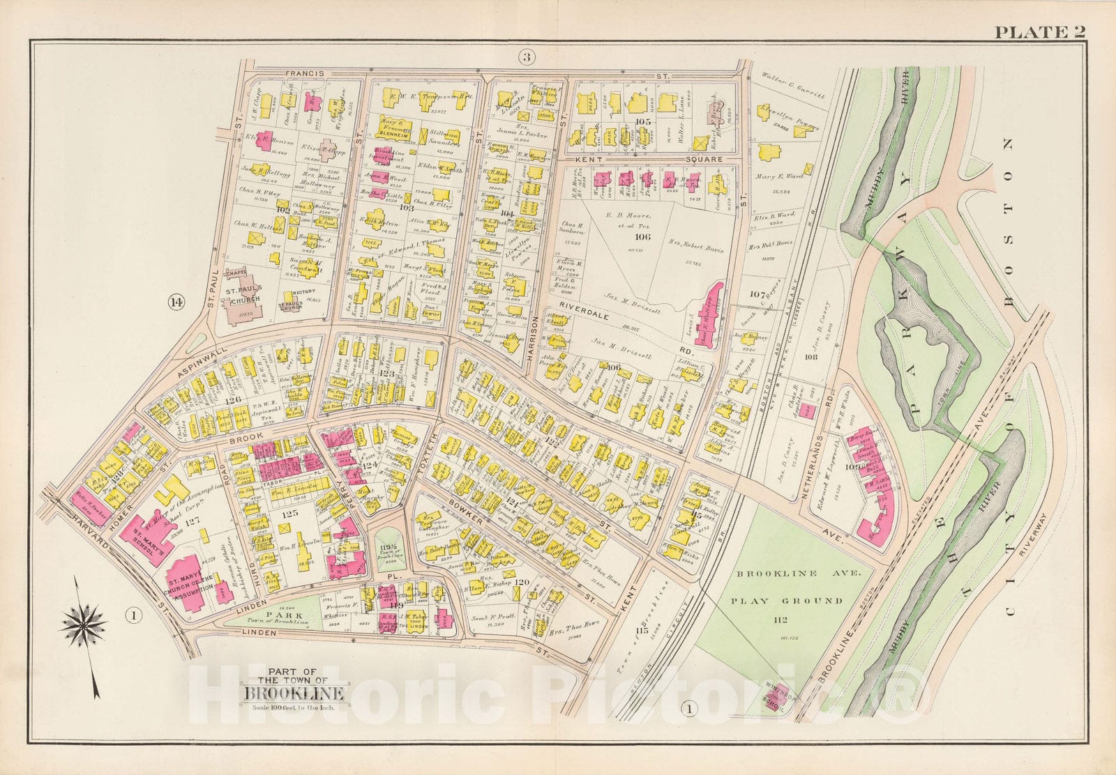 • .Historic Map : Atlas Town of Brookline, Brookline 1907 Plate 002 , Vintage Wall Art