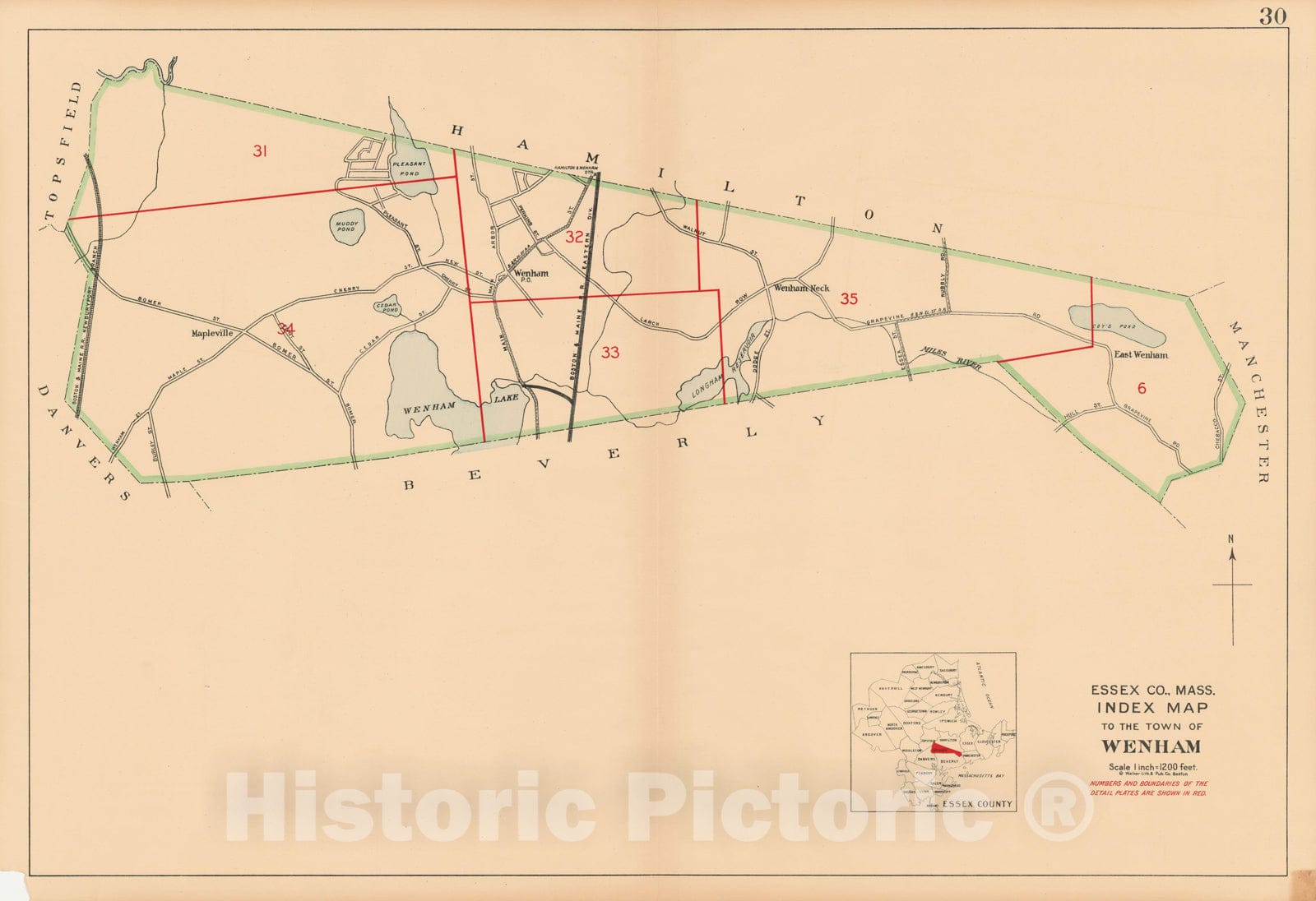 Historic Map : Atlas Towns of Topsfield, Ipswich, Essex, Hamilton and Wenham, Essex County, MA, Wenham 1910 Plate 030 , Vintage Wall Art