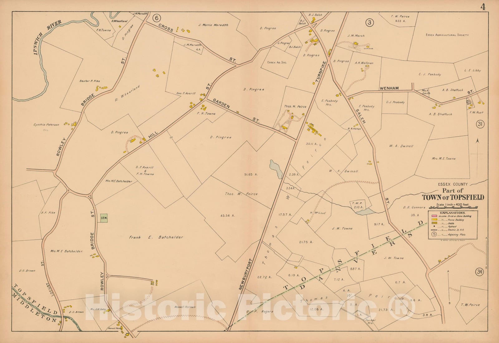 Historic Map : Atlas Towns of Topsfield, Ipswich, Essex, Hamilton and Wenham, Essex County, MA, Topsfield 1910 Plate 004 , Vintage Wall Art