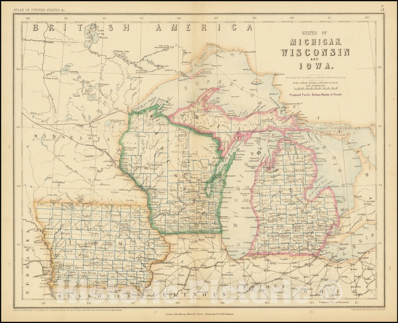 Historic Map : States of Michigan, Wisconsin, and Iowa, 1857, Vintage Wall Art