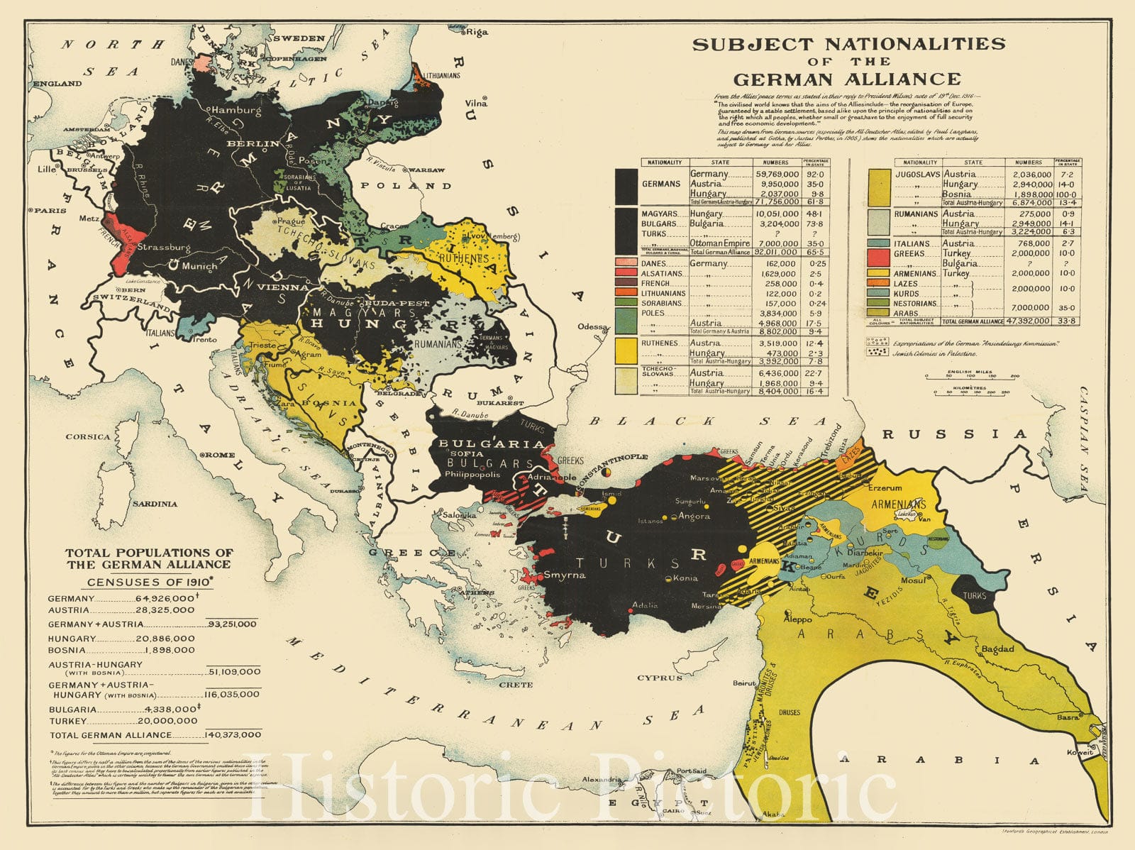 • .Historic Map : Subject Nationalities of the German Alliance, 1916, Vintage Wall Art