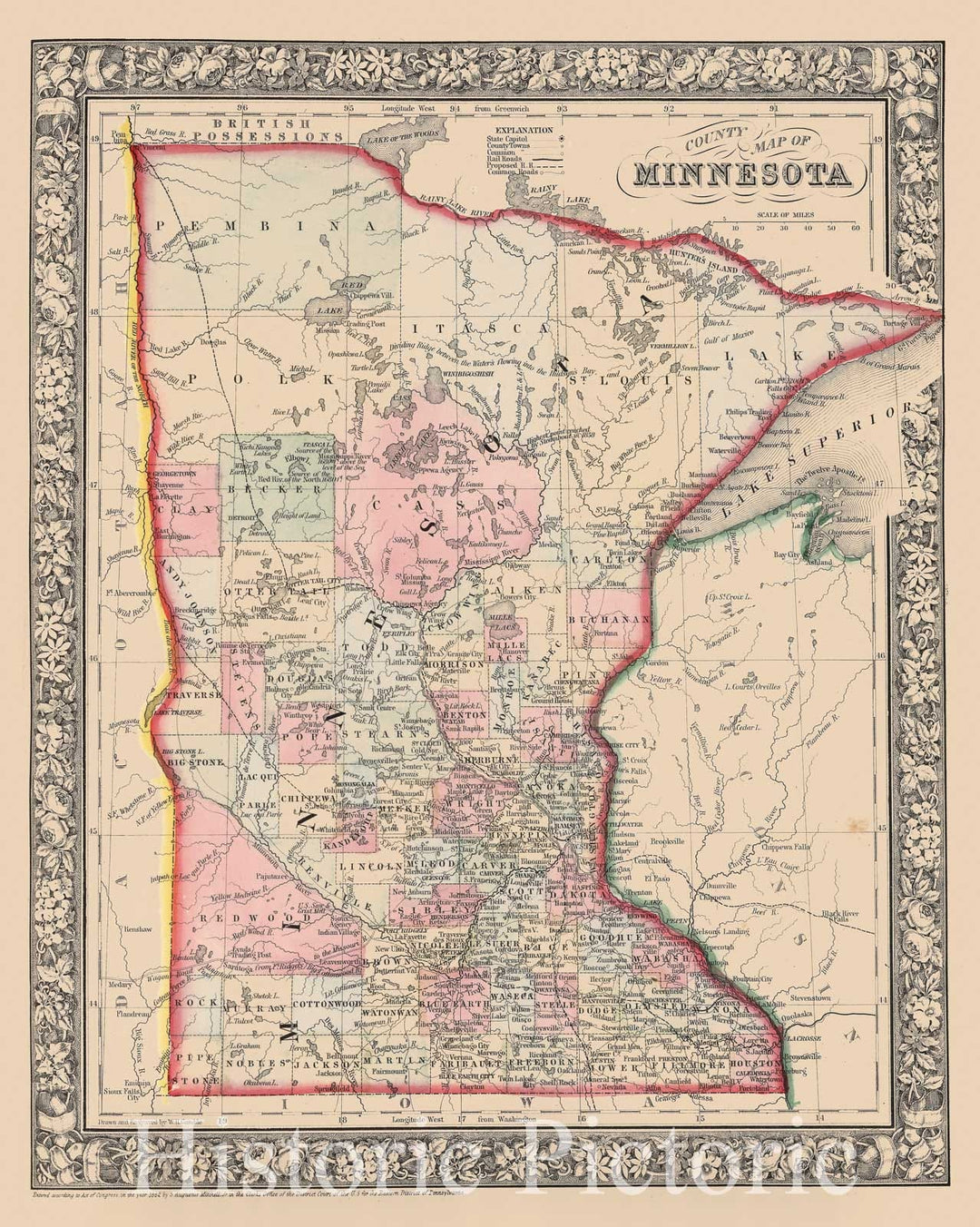 Historic Map : Minnesota 1882 , Mitchell's New General Atlas , Vintage Wall Art
