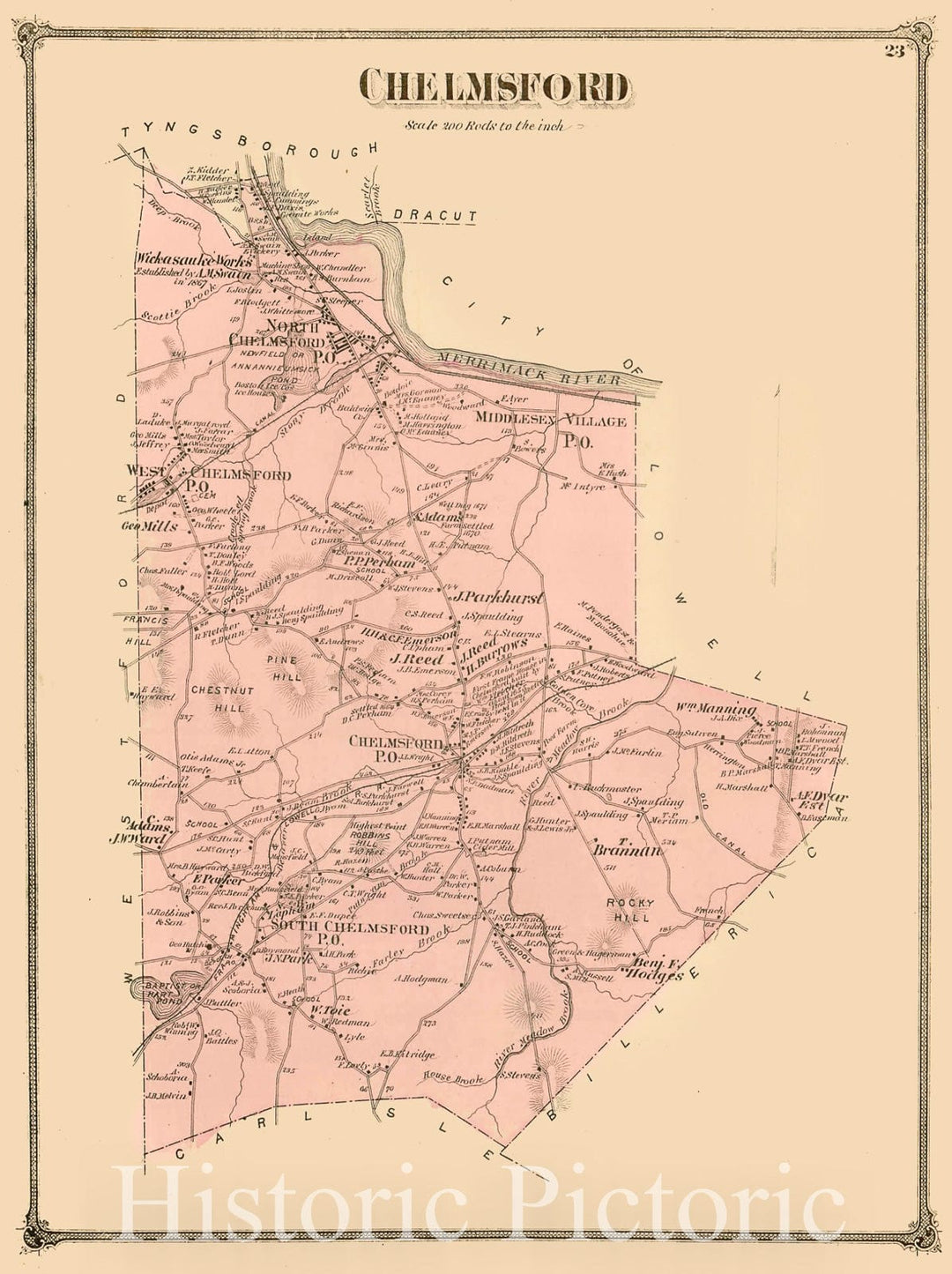 Historic Map : County Atlas of Middlesex Massachusetts, Chelmsford 1875 , Vintage Wall Art