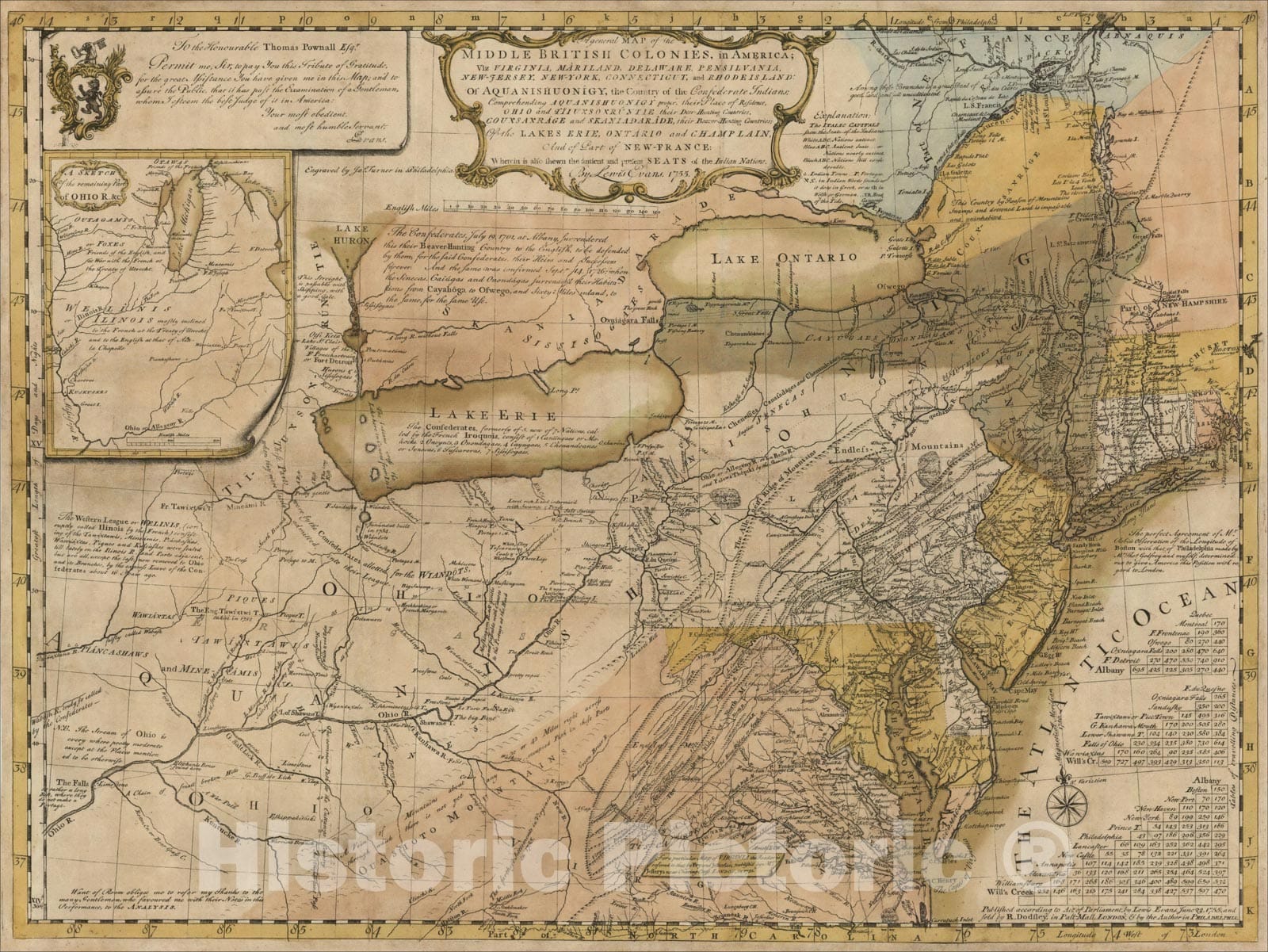 Historic Map : British Colonies in America; Virginia, M?yland, D?aware, Pensilvania, New-Jersey, New-York, Connecticut, and Rhode Island, 1755, Lewis Evans, Vintage Wall Art