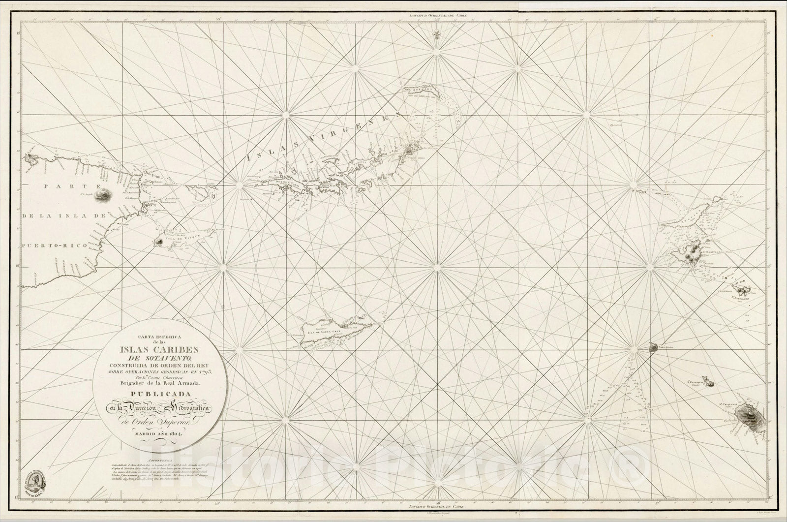 Historic Map : Virgin Islands, St. Kits, St. Barts, St. Martin, Carta Esferica de las Islas Caribes De Sotavento, 1804, Direccion Hidrografica de Madrid, Vintage Wall Art